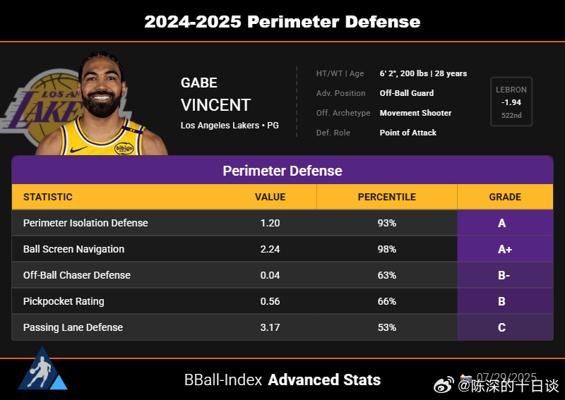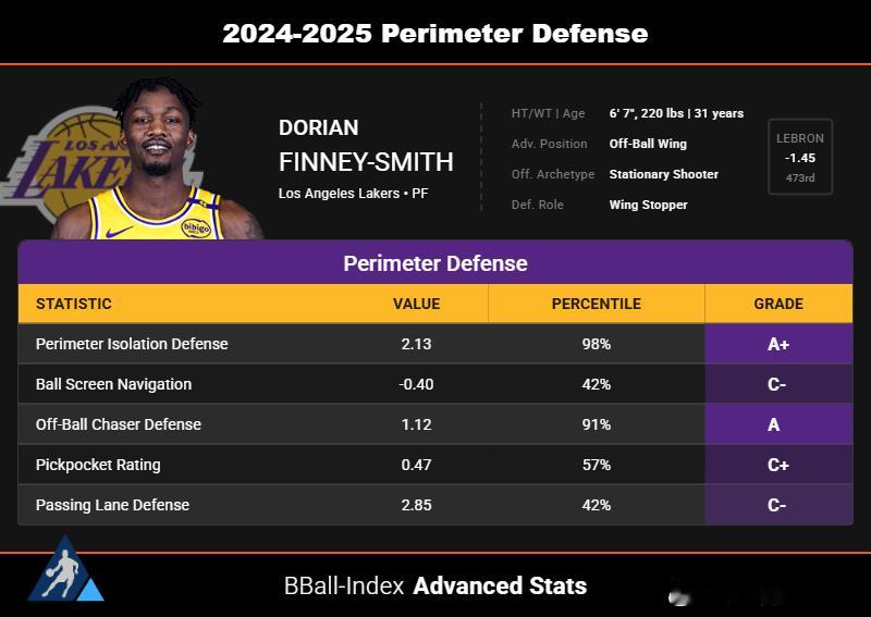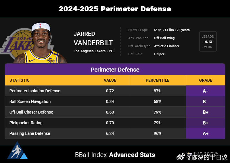 给昨天的文章做一个补充:对比一下湖人各个防守人2024-25赛季的外线防守各项评级。