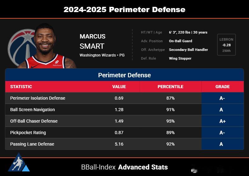 BBI给斯玛特的评级和我自己看录像后的评级吻合度非常高:斯玛特的单防观感不错,但25赛季防守效果有下滑(被进球比以往多);领防掩护看起来比防单打更好,但比起“最顶级”有一些差距;追防无球掩护(防接球)是最强项,顶尖水准;抢断、截断侵略性很强。