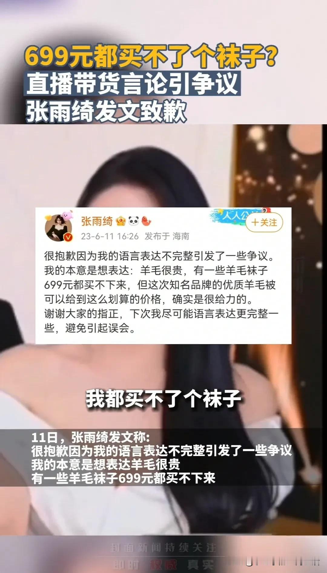 张雨绮699元?我都买不了双袜子,张雨绮直播言论致歉,所谓的明星直播带货,就是把