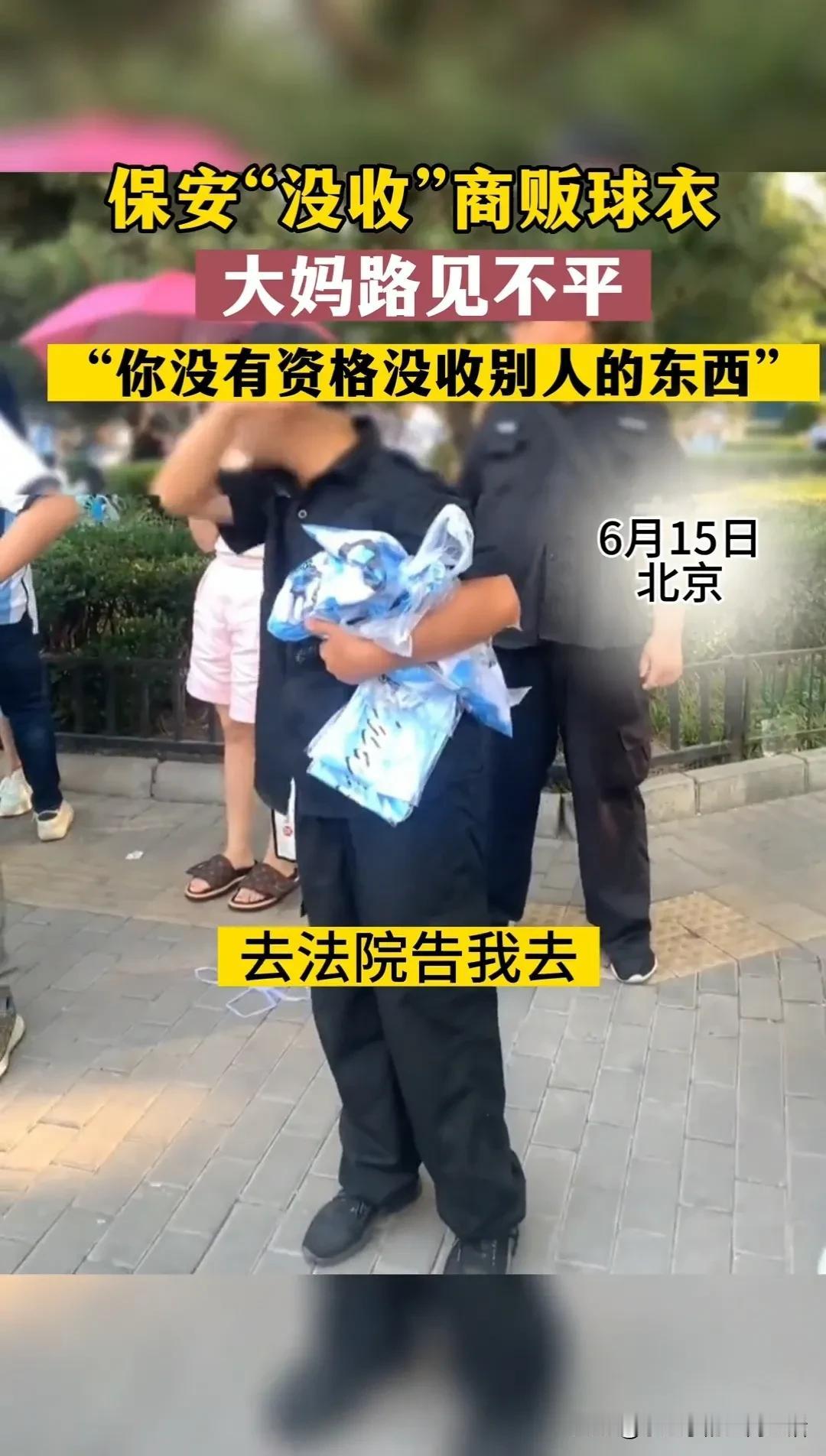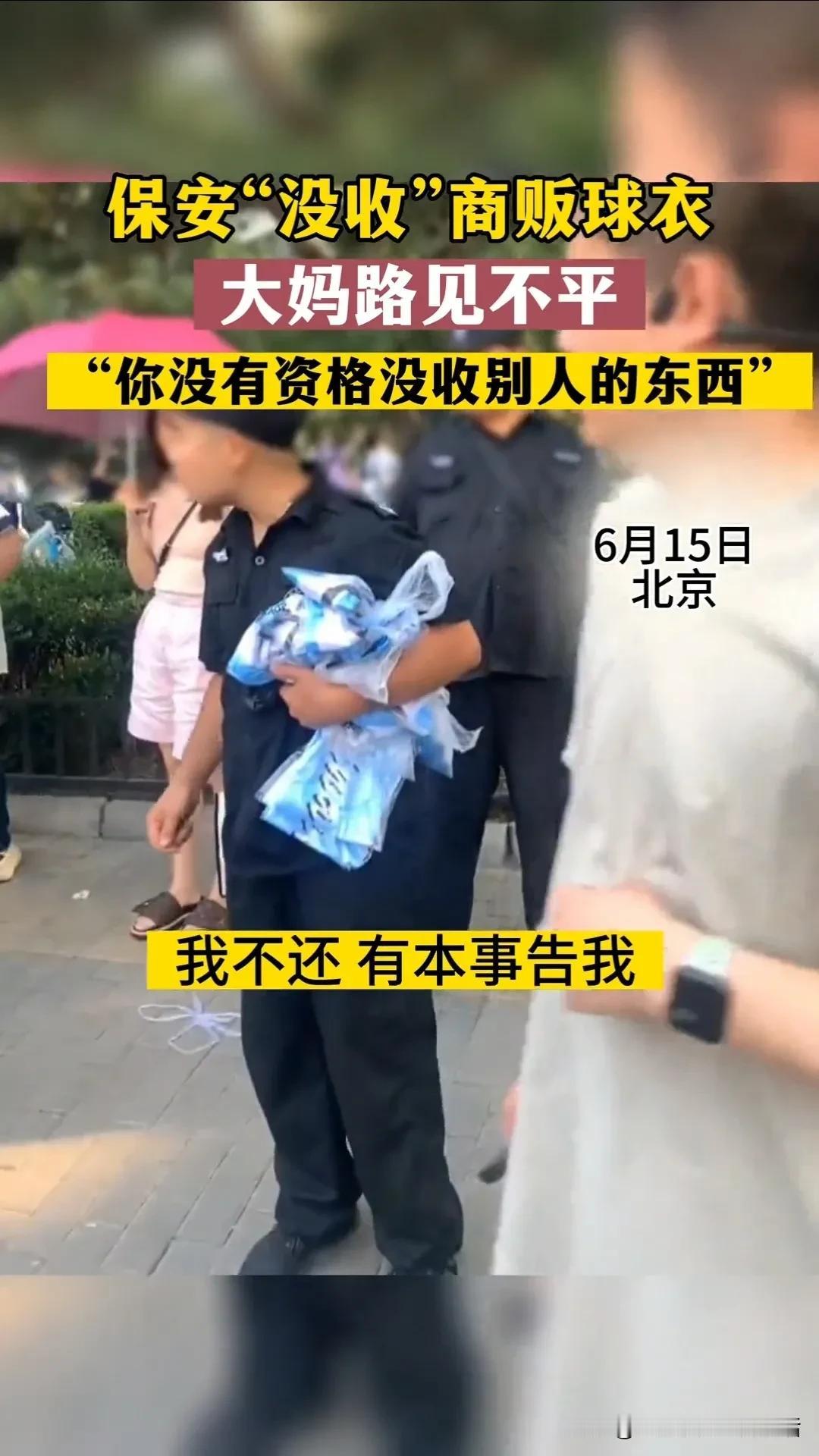 凭什么还,我不还,有本事去法院告我!一个保安没收商贩卖的球衣,大妈看不过眼说老百