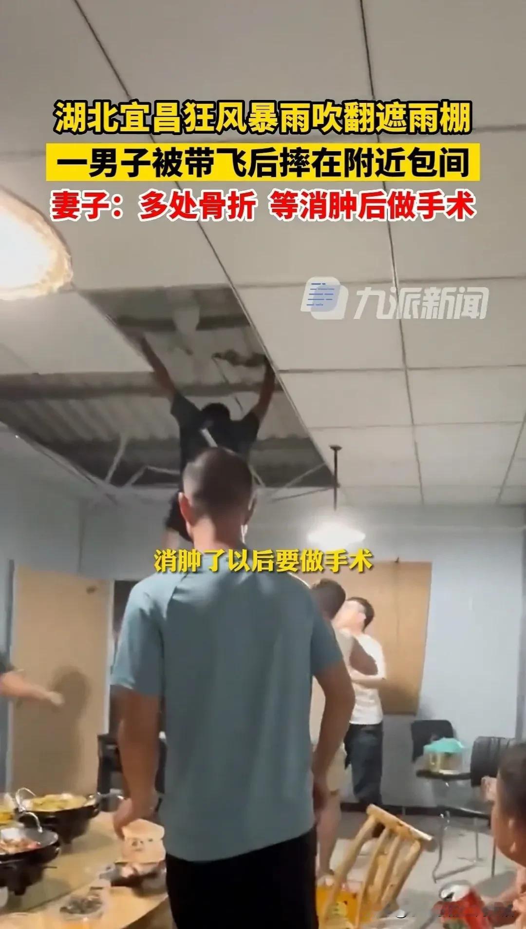 宜昌暴雨遮挡棚多人被带飞,飞上天的大哥后续来了,大哥被带飞后摔到附近的包间了,据
