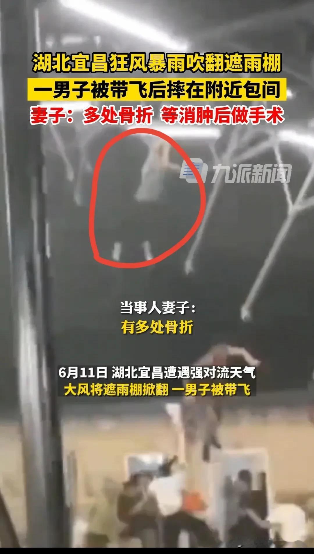 宜昌暴雨遮挡棚多人被带飞,飞上天的大哥后续来了,大哥被带飞后摔到附近的包间了,据大哥的妻子说大哥多处骨折,等消肿后在做手术,现在左脸都是肿的说话也不利索了,大家都说大哥是好人,其实只要大家都不放手的会基本上没事,也有人说人类无法跟大自然对抗,即使大家不放手当风力达到一定的程度这么多人都会带风,不管如何没有生命危险就好,只是这受伤无法工作苦的就是自己了。