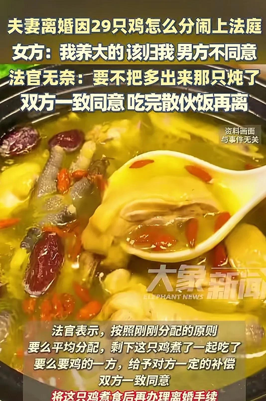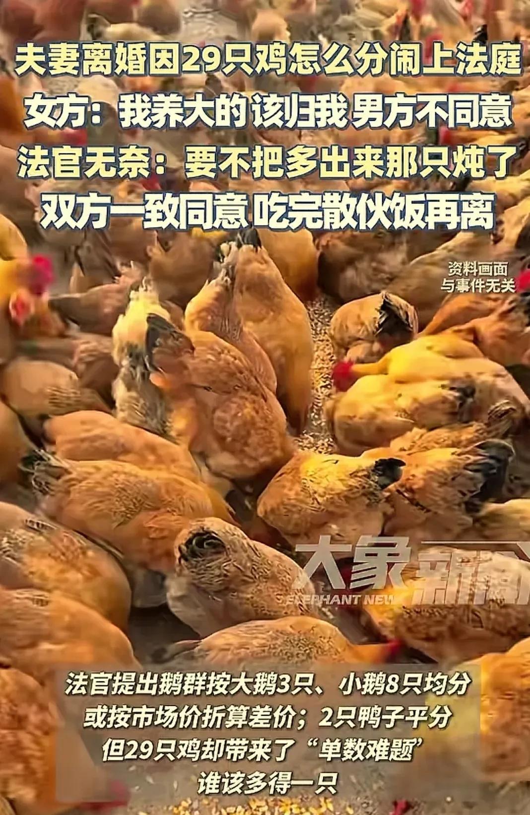“闻所未闻。”四川广安,一对夫妻离婚,因53只家禽大小、数量分割不均闹上法庭。鸭子和鹅按大小分完以后,29只鸡成了难题,双方都不同意对方多要一只,据理力争,就连村里的长辈都束手无策。法官做出调解后,没想到,双方居然一致同意了。 根据媒体8月5日报道,中年夫妻因离婚财产分配不均,杨大哥把涂大姐告上法 院,法官听到两人要求均分53只家禽,吃了一惊,差点以为是小孩子过家家。 原来夫妻俩以杨大哥打零工和涂大姐饲养家禽为生活来源,房子是男方的宅基地,不能动,剩下的就家禽,可以说两人都舍不得拱手让给对方。 法官无奈的看着两个因为家禽你争我夺的人,好不容易按个头大小分配完了鸭子和鹅,还因为29只单数的鸡吵起来了。 面对法官调解,涂大姐据理力争:“这些都是我亲手养大的,尤其是那几只大的。” 杨大哥则反驳:“鸡鸭小时候我也喂过!应该大小各一半。” 双方都认为自己在这方面付出的更多。如今这场景,竟然让人想起别人离婚时双方争夺孩子的场面,只不过到了这里换成了家禽。 并且这两人因为这件事,在村里已经闹了大半年,问了孩子,也请了长辈出主意,都没有成功。今天就是来请法官解决一下问题。 法官思来想去,脑中一个闪现,突然有了办法,当即说道:“多出来的一只,你们煮了一起吃,就当散伙饭。” 话一说完,两人同时愣住了,沉默了好一会,都觉得法官说的有道理,既然不能便宜对方,还不如自己吃了实惠,问题得到解决,两人这才满意的走出了法 院。 事情被发到了网上,网友都已经吵翻了,说什么的都有。 有的网友帮忙出主意:何必炖了,一起养到出栏的时候分钱,就啥事也没有了。 也有的网友说:难道就不能按重量来分吗? 网友说的不无道理,但是按重量或者出栏来分,可能要等很长时间,中间很可能会出现变数也说不准,所以这位法官的办法既有智慧又有生活还让矛盾得到化 解,无论如何只要当事人能够接受,那就是最 好的办法。 有人说:两人离婚了,难道连一只鸡都不能让吗? 在农村,家禽是一部分收入来源,是来客人时的硬菜,养大能下蛋都要好几个月,怎么可能给别人? 城里人分的是房子车子,农村人分的是鸡毛蒜皮,可这点东西,就是他们的整个世界。 很多人笑他们为家禽上法庭,但农村离婚财产分割确实复杂!宅基地不能分,只能分一些家禽,农具之类的物件。看似荒诞的背后,连一只鸡都要争,其实是为了以后的经济保障,因为这就是两人的全部,家里真的没有别的可以争了。 对此,你觉得还能怎么分呢? (来源:大象新闻)