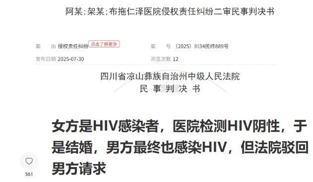 [微风]四川凉山,男子与女友在一医院做了艾滋病检查,在结果显示两人均未感染后便同居结婚。怎料,几个月后,男子再次检查身体却被确诊感染了HIV,又得知女友早就被疾控中心确诊为HIV患者,难以释怀,先是投诉、报警,而后又将女友及医院告上法庭,向女友及医院索赔57万余元损失。但法院这样判! “我怎么会感染 HIV?我们之前检查不是都没事吗!” 阿强满脸惊恐,对着女友小美嘶吼道。 几个月前,在四川凉山阿强和小美在当地一家医院做了艾滋病检查,结果显示两人均未感染,欢天喜地的二人随后便同居结婚。 可命运就爱捉弄人,几个月后,阿强再次检查身体时,竟被确诊感染了 HIV,阿强不敢相信这个结果,自己结婚后就只和小美在一起过,而且之前检查都没有感染,现在怎么会莫名其妙的感染上这种病。 阿强又去别家医院做了检查,结果还是阳性,阿强不解问题出在哪里,直到后来他得知了一个让他崩溃的消息。 原来女友小美早就被疾控中心确诊为 HIV 患者,在他们两个人一起做检查之前就已经被确诊了,可问题是为何他们当时的检查结果却显示未感染艾滋病!阿强这才放心和小美在一起的。 难以接受现实的阿强,先是投诉医院漏检,又报警告女友故意传播性病,最后将医院和女友一起告上法庭,索赔57万余元。 阿强觉得,医院没查出小美的艾滋,导致自己误判风险,必须负责,而小美明知自己患病,却故意隐瞒,还和自己无保护同居,更是罪无可恕。 法院审理后却认为,医院检测的对象是小美,只需对小美负责,没义务主动告知阿强结果。医院的漏检和阿强感染艾滋之间没有直接因果关系,不构成侵权。 至于小美,虽然行为不道德,违反了《艾滋病防治条例》中艾滋患者需告知性伴侣并做好防护的规定,但阿强没有证据证实自己的艾滋是小美传染的。 艾滋潜伏期长,感染途径多样,阿强提供的线索只能算 “高度可能”,达不到 “唯一确定” 的标准。最终,法院驳回了阿强的诉求。 此判决一出,网友们吵翻了天。网友认为法律讲证据,不能靠情绪判案,医院又不是婚检机构,阿强自己恋爱时不谨慎,怨不得别人。 但更多网友则对小美和医院的行为表示愤慨,指责小美明知有病还隐瞒,简直是故意害人! “医院检测失误害了人还不负责?要是当时提醒阿强说不定会进一步检查,悲剧就能避免!” 确实,这起案件暴露了诸多问题。从医院角度看,即便检测行为与阿强感染无直接因果关系,但漏检本身就反映出其检测流程或许存在漏洞,应进行反思和改进,以提升检测准确性和公信力。 而小美隐瞒病情的行为,无疑违背了最基本的道德准则,给他人带来了巨大伤害,虽然法律因证据不足无法让她承担赔偿责任,但她的行为在道德层面应受到严厉谴责。 总之,这件事给所有人敲警钟:别轻信一张检测报告,尤其是涉及重大传染病。婚前一定要做全面体检,而且必须去大医院反复查!