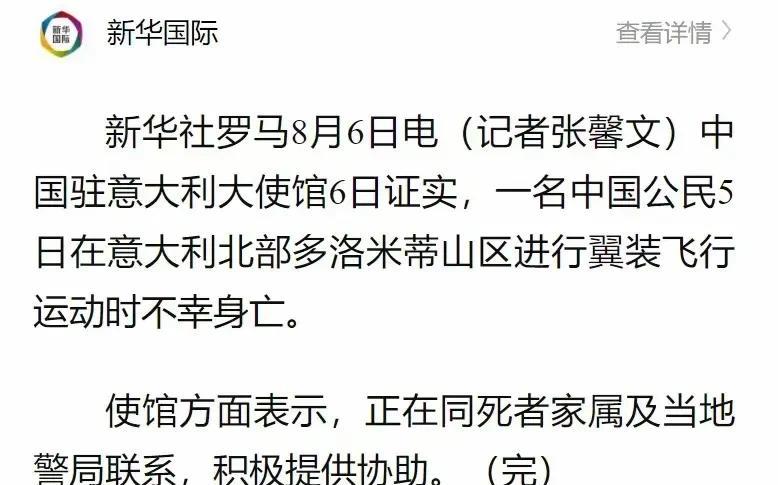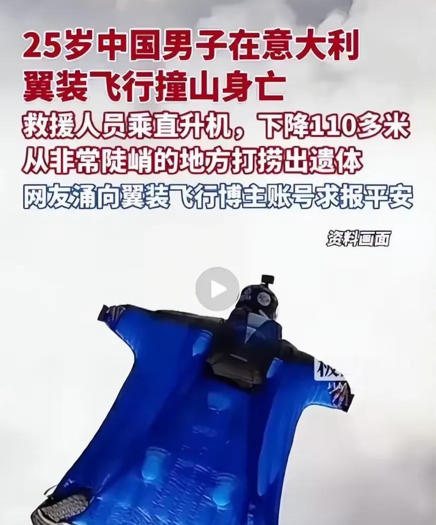 翼装飞行顶尖高手”遇难,当场宣布死亡!年仅25岁 中国驻意大利大使馆6日证实,一