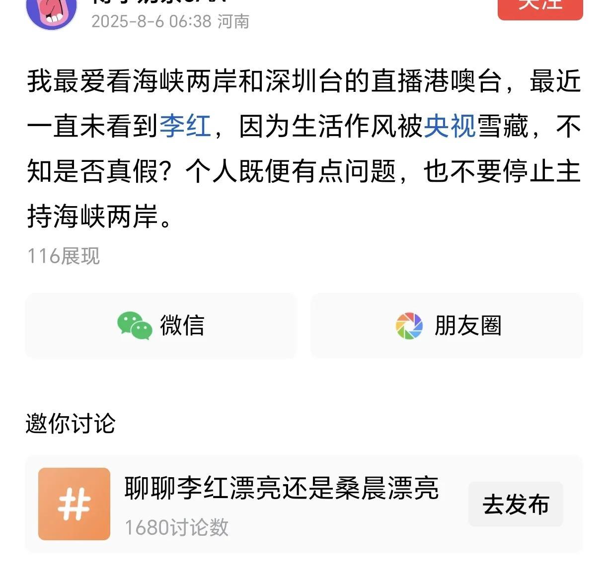 有些人造谣李红失联,究竟是什么心思? 央视每个年都有一周至两周的主持人休假,李红上周没有出现自然就是正常休息,没有超出主持人正常周期, 昨天(8月6日)和今天(8月7日)播出的海峡两岸,都是李红主持, 今天就是她报道特朗普关税问题, 结果8月6日到7日,这些网友和没看见一样造谣李红失联! 这样恶意的造谣,甚至暗示李红因为私生活问题停止主持,居心何在?