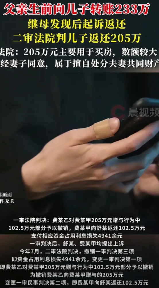 双方均不服判决而上诉。 二审法院判定,父亲未经妻子同意,属于擅自处理夫妻共同财产,继子应返还继母205万。