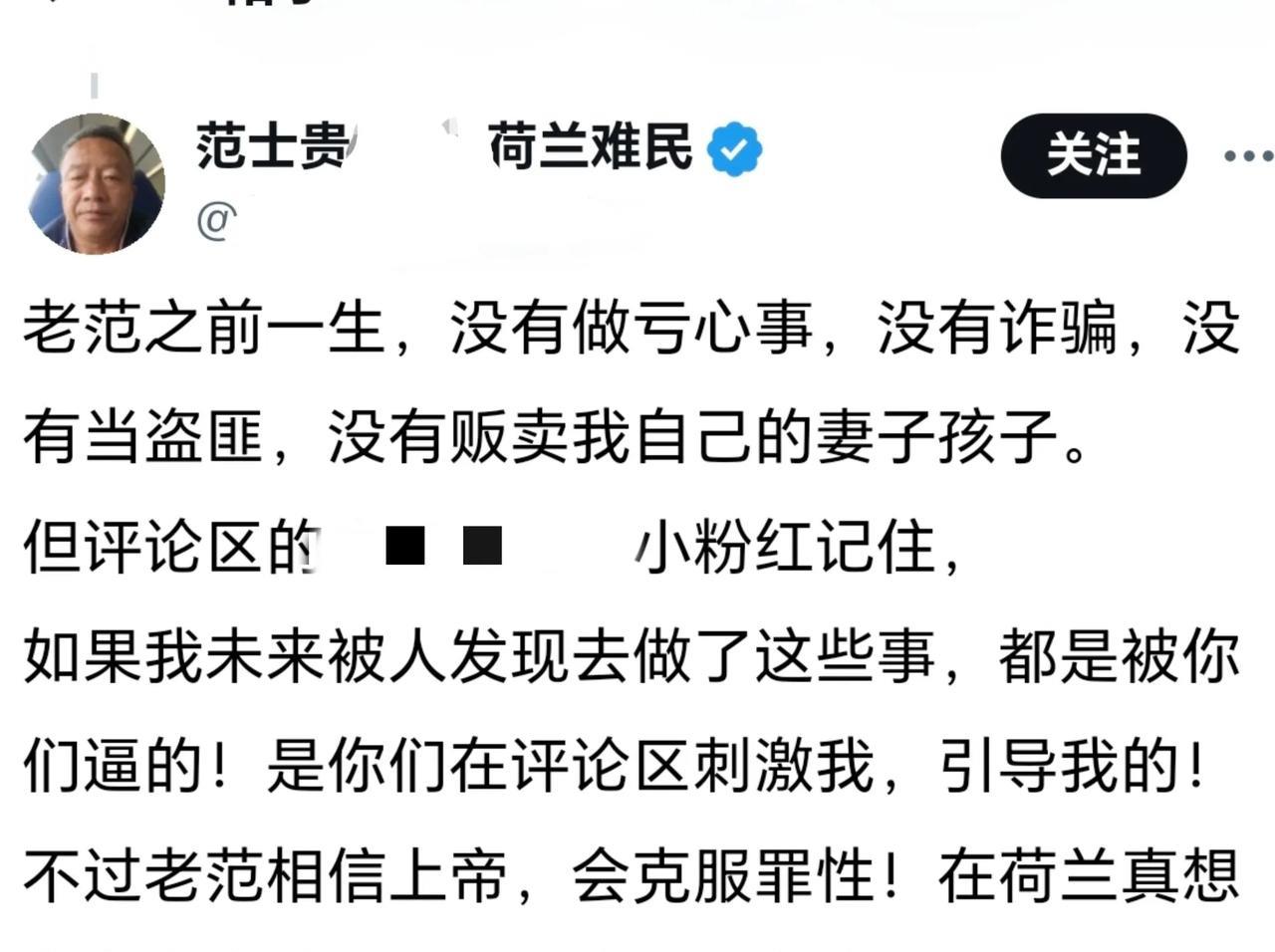 公知范士贵在荷兰被歧视。 都2025年了喂!这小伙怕不是刚从古董相框里爬出来?看到活体中国人第一反应居然是检查后脑勺?这刻板印象的“辫子雷达”灵敏度,他递纸条的姿势,想必充满了发现“活恐龙”般的学术惊喜吧? 被当成“珍稀无辫物种”围观,范士贵居然能心平气和?还“不恨荷兰甚至不恨小伙”?这胸怀,比荷兰围海造田的堤坝还宽广!主管让“别声张”,估计是怕上了荷兰热搜,丢不起这人。 神转折来了!老范这锅甩得那叫一个荡气回肠、穿越时空!居然怪罪中国网友把自己连累了 老范这“被连累”的觉悟,简直感天动地!仿佛自己脑后没辫子不是天生,而是忍辱负重替谁“负重前行”去了。小伙无知是表象,根源是“粉红”在平行宇宙拉低了老范的形象分?这受害者心态修炼得,荷兰郁金香都自愧不如。