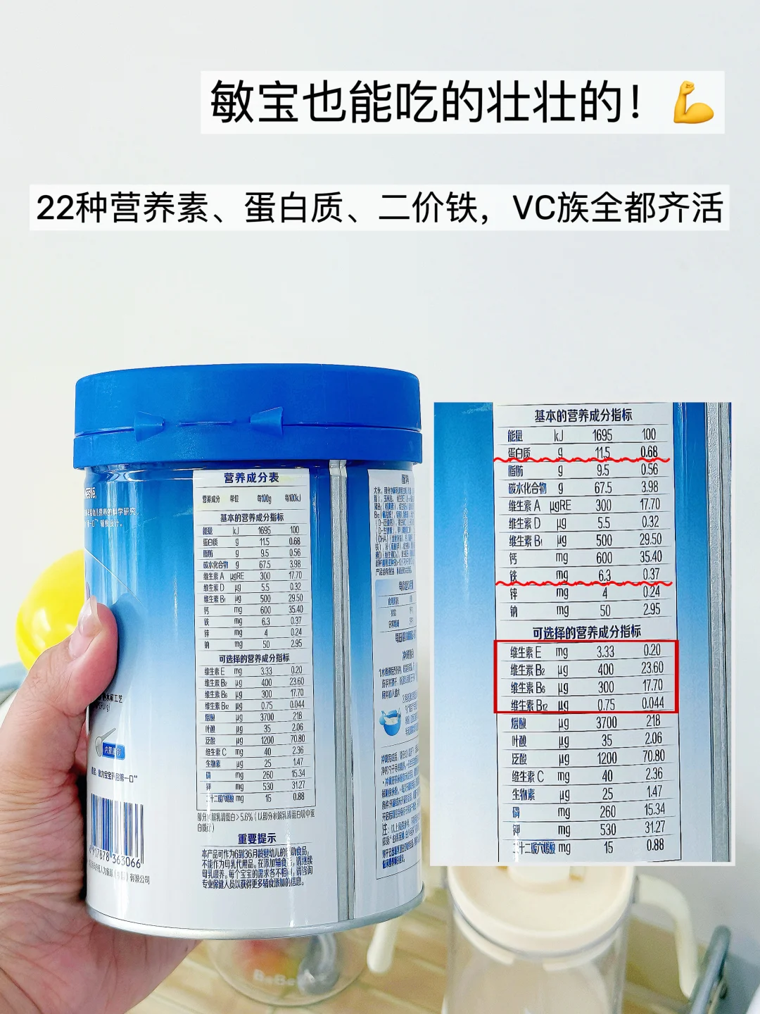 而且6个月后宝宝对蛋白质需求翻倍,我对比了下嘉宝配方米粉的配料表,每100g就有11.5g动植物双蛋白,相当于吃了两顿普通高铁米粉的量呢~还有6.3mg高铁+22种营养素,DHA、钙、锌全都齐活,敏敏宝也能吃得壮壮的!