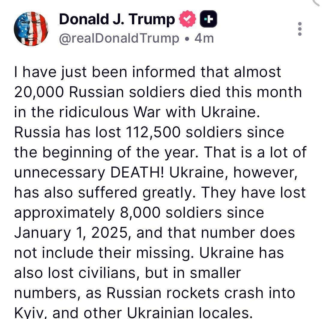 特朗普公布了俄乌死亡人数,从今年年初开始,俄罗斯死亡11万左右的士兵,而乌克兰死亡8000左右士兵。 8月1日一早,美国总统特朗普拿起手机,发了一条震动全球的帖子。 他写道,自年初以来,俄罗斯军队阵亡约112500百人,乌克兰方面则阵亡约8000人。他还特别提到,就在刚过去的7月,又有近20000名俄罗斯士兵在这场他口中的“荒谬战争”中死去。 消息一出,全球媒体立即炸开了锅。这条没有预告的帖子,并非一次心血来潮的举动。就在几天前,特朗普刚刚把俄乌和谈的最后期限从五十天猛然砍到了十至十二天。 他直白地告诉记者,自己“看不到任何进展”,言语间满是恼火与不耐烦。 他想用这组惊人的伤亡数字,以及将战争归咎于前任“拜登”的说法,把自己塑造成一个真心希望停止流血的和平使者。 他引用的俄军阵亡数,恰好落在俄罗斯独立媒体和西方情报机构的估算之间,这让数字显得既有冲击力,又不至于太离谱。 但这只是他计划的一部分。真正的施压来自于经济层面。 特朗普政府放出风声,威胁要对继续购买俄罗斯能源的国家,比如中国和印度,征收高达100%的惩罚性关税。 这直接瞄准了俄罗斯每年九百亿美元的能源收入,远比制裁那点早已萎缩九成的美俄贸易要狠得多。 然而,就在他发出威胁的前一天,俄罗斯军队刚刚占领了顿涅茨克地区的战略小镇恰西夫亚尔,并且正朝着下一个重要目标“红军村”步步紧逼。 早在六月,普京就已经明确表态,俄罗斯“不接受胁迫”。 一个在战场上占着上风的对手,又怎么会因为几句威胁和一组数字就轻易让步? 俄乌双方的根本分歧是土地。乌克兰要收回包括克里米亚在内的全部领土,而俄罗斯坚持顿巴斯独立。这个问题不解决,任何谈判都只是空话。 同时,战争的痛苦正在乌克兰蔓延。在后方的利沃夫等城市,新的军人墓地不断扩建,工人们挖土立桩,一排排新的墓碑悄然竖起。 葬礼队伍抬着棺木穿过街道的场景,让民众的厌战情绪越来越浓。很多人只是单纯地希望战火能停下来。 特朗普的极限施压,最终起到了反效果。外部压力没有击垮俄罗斯,反而激起了强烈的民族情绪。五万名莫斯科市民走上街头,高喊着反对美国的制裁。 俄安全会议副主席梅德韦杰夫的回应更加直接,他称特朗普的最后通牒是“迈向战争的一步”。 经济上的反噬也来得很快。 消息传出后,国际油价立刻上涨,布伦特原油突破了85美元一桶。更有经济研究机构测算,如果二级制裁全面实施,全球贸易成本将增加1.2万亿美元,并反过来推高美国自己的通货膨胀,可谓伤人伤己。 说到底,特朗普只是想尽快结束这场战争,好让他能集中精力去对付东方的大国。 但当他发现俄罗斯不按他的剧本走时,他的不耐烦最终变成了一场高风险的个人秀。他试图在谈判桌上拿到战场上拿不到的东西,这本身就行不通。 有时候想想,这种极限施压的方式,真的能带来和平吗? 事实证明,所谓最后通牒不过根本没有用。