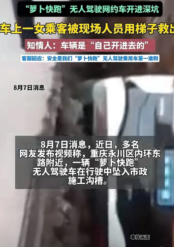 重庆永川区,一辆无人驾驶的“萝卜快跑”载着女乘客,掉进了正在施工的沟槽之中。 槽深三米左右,女乘客自行打开车门出来,在群众的帮助下,顺着梯子爬了上来,并未受伤。