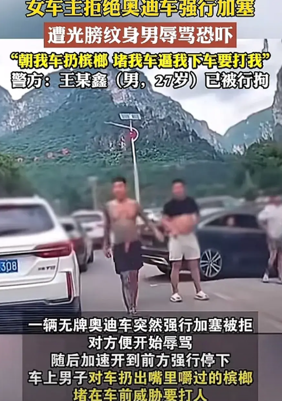 山西晋城,女司机不让无牌奥迪车加塞,奥迪车强行挤入后便停了下来。车上下来三个男人,开车的是个光着膀子且身上有“雕花”(类似纹身)的人,他满脸凶相地走到女司机车前,指着坐在驾驶座的女子骂骂咧咧,还敲打车窗,让女司机下车,并且把嘴里的槟榔吐到女司机车上。