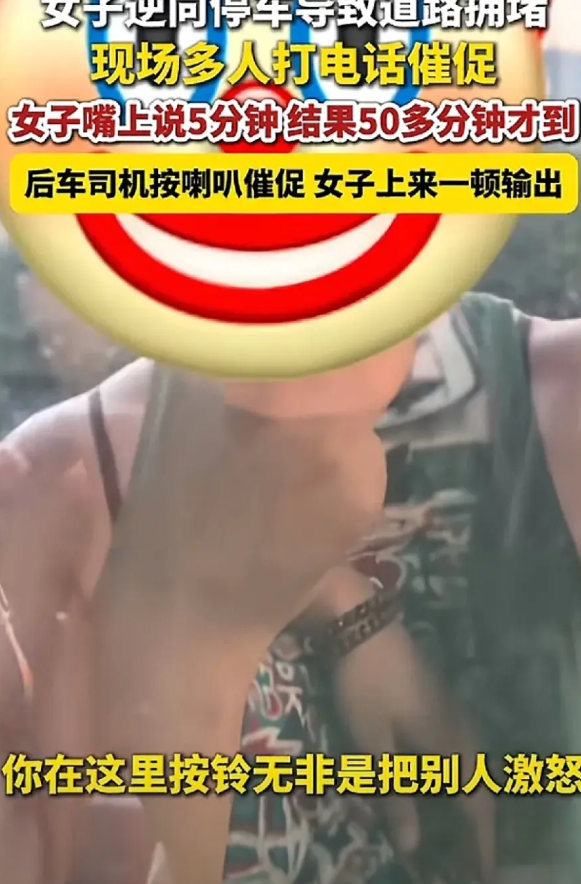 女子逆行将汽车停在路上,致使交通堵塞。第一辆车的司机不断拨打女子的电话,女子首次接听电话后称:“五分钟就到。”