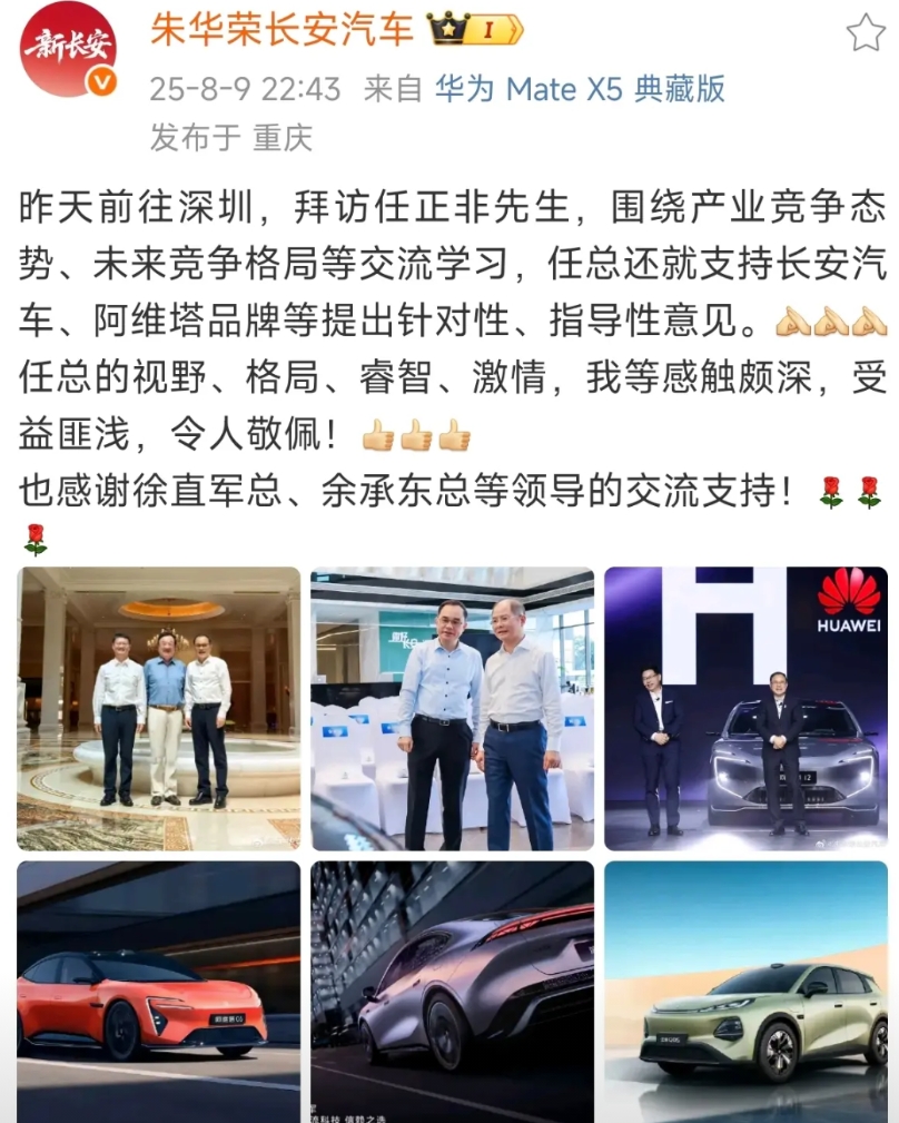 新央企长安汽车董事长、阿维塔科技董事长、引望副董事长、我互联网上的兄弟朱华荣,昨