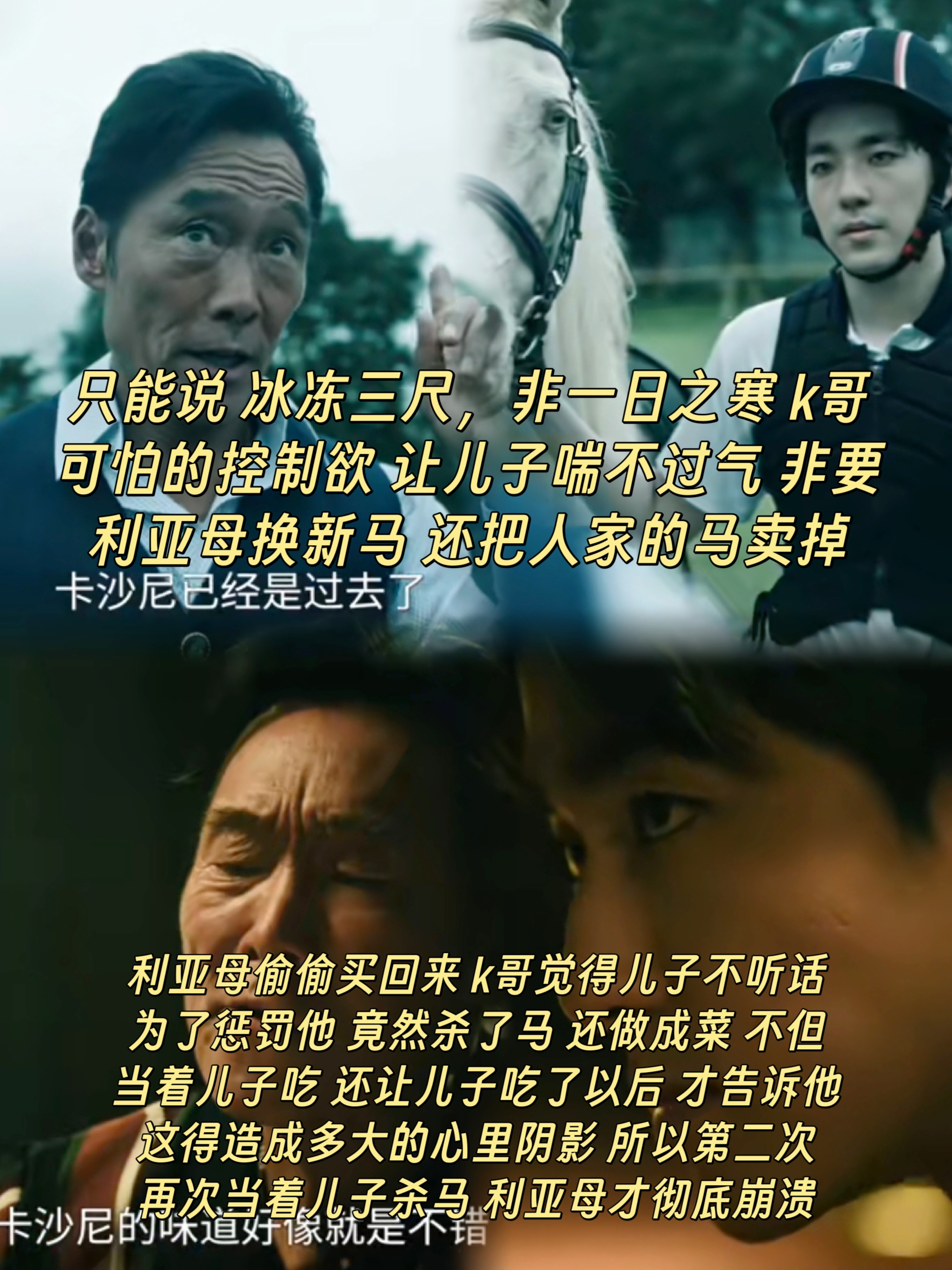 压垮儿子最后的稻草,是父亲的独断专行[哭哭] K哥最后逃命,儿子非要带着马,气得K哥一枪打死马,想解决拖累,让儿子赶紧和他走,本以为会像以前一样,他一发怒,儿子就妥协,可是积压了太多的怨恨,终于逼疯儿子,K哥儿子对亲爹K哥连开2枪,直接让他丧命。[抠鼻] 如果从第一次,K哥没有卖走儿子从小一起长大的马,如果K哥没有在儿子偷偷买回老马后把马做成菜,是不是儿子不会这么恨他?[思考]