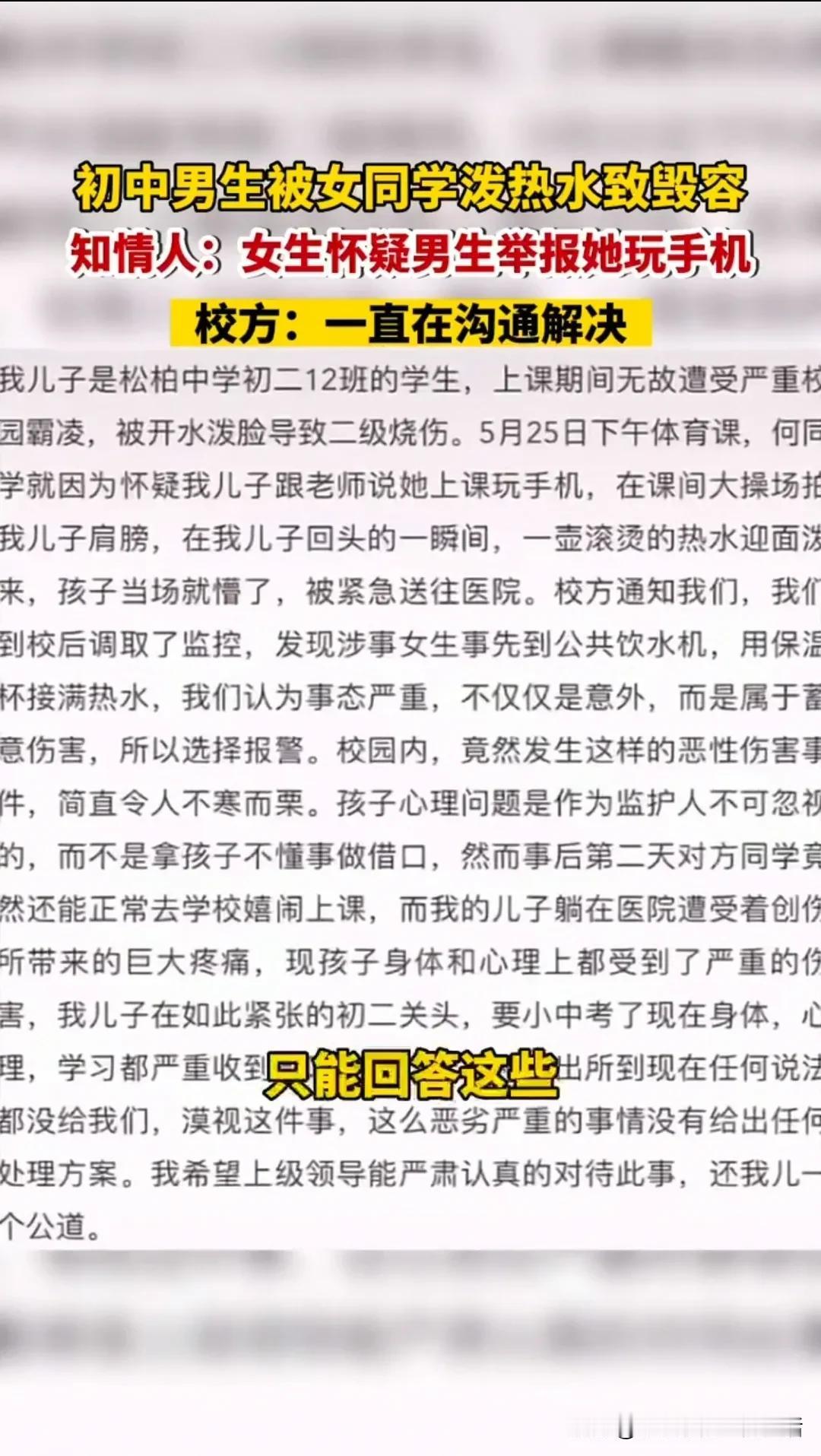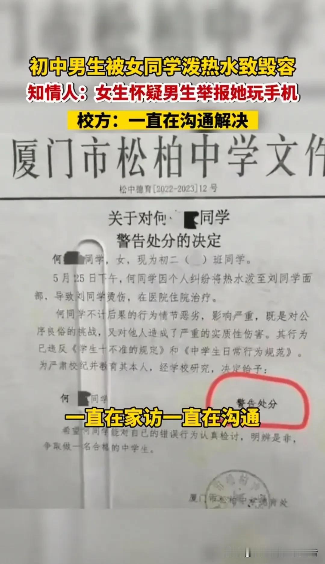 初中女生拿开水往男同学脸上泼,事后还叫嚣你能拿我怎样? 据报道厦门某女生怀疑男同学向老师举报她上课玩手机,就把开水直接往男同学脸上泼,给男同学脸上造成二级烫伤,据男同学家长说第二天女生还正常上学,学校只是给了处分。 而女方家长却说孩子五年级时就有忧郁症,另外还告知学校如果处理不当导致女儿自杀学校脱不了干系,而且女方家长怀疑是男同学长期欺负自己的孩子,而且泼开水没有证据可能是意外。 目前学校正在处理之中,先不说谁对谁错这种伤害是一辈子的,不管是男是女都应该严惩,赔几百万他的脸都还是毁了,在看女方的家长说出来的话就是一种无赖,跟事后女生叫嚣着说不能拿她怎么样,所谓有其父必有其女,这教育的不错!