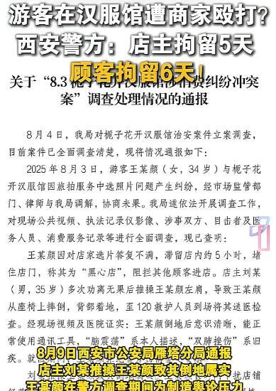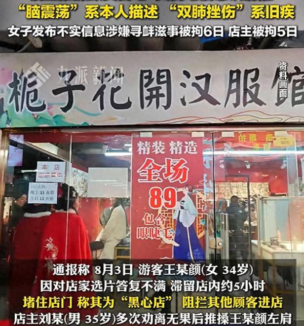 原来,王某颜因为照片选片问题和老板发生争执,当她来到该店准备选片时,却被告知选片师傅下午才来,她本人表示下午要回青岛,要求在微信上选片,被老板拒绝。 这下子,王某颜的火气就上来了,她本来就认为老板在拍照过程中服务态度差、服装质量粗糙,现在又来了这么一档子事,所以开始大吵大闹,并堵门干扰老板做生意。 老板刘某十分无奈,女子的所作所为已经严重干扰了他的正常经营。无奈之下,只好找来民警协调。当民警到来的时候,女子还坚持在门口闹事,也不提回青岛的事了,继续和刘某吵闹。 民警一共来调解了两次,每次都是民警在的时候说的好好的,民警一走就故态复萌。 刘某也是被王某颜的行为激怒了,便推搡了她一下。这一下还真把王某颜推倒了。她开始躺在地上叫疼,刘某也吓了一跳,赶紧拨打120送去医院。 事件到这里为止,还是商家和消费者纠纷导致的推搡,王某颜完全可以以此获得一定的赔偿,但她后来的做法却令人大跌眼镜。 王某颜倒地后意识清醒、能正常使用手机,但她马上在网络上声称摔出了“脑震荡”,以此博取同情。 经过医院的诊断,她的说法完全属于谎言,没有任何医疗证据,而她在多个视频里声称的“双肺挫伤”,其实是她自己几个月前所受的旧伤,跟本次事件毫无关联,而且也没有复发的迹象。 更令人愤慨的是,她坚定的拒绝了民警的伤情鉴定要求,却转头在网络上炮制出“被殴打致昏迷”、“孩子挨饿无人管”等虚假信息,利用媒体煽动舆论。 此事被报道后,果然激起了网友的不满。网络上清一色的同情王某颜的遭遇。然而等官方的通报出来之后,大家都傻了眼。 本案中,刘某的推搡行为虽导致王某颜摔倒,但未造成严重后果,属“情节较轻”情形,故处5日拘留。 对于王某颜来说,根据《治安管理处罚法》第二十六条第(四)项:“其他寻衅滋事行为”,处5日以上10日以下拘留,可并处500元以下罚款;情节较重的,处10日以上15日以下拘留。 以及《网络安全法》第十二条:“任何个人和组织使用网络应当遵守宪法法律,不得危害网络安全,不得利用网络从事法律、行政法规禁止的活动。” 这场因为拍照引起的纠纷,最终以双方被罚、店铺停业、公共资源被滥用、网友被耍了一通而收场。但是它引起的舆论风暴还远远没有停止。 有的网友质疑通报里对于事件的起因一笔带过,并以此质疑对于王某颜的处罚不合理。事实上,事情起因的选片风波属于民事纠纷,并不构成对于王某颜的刑事处罚。 不要用错误的方式争取自身利益,这样只能把事情搞得更复杂。对于看客而言,对于尚无定论的事情,还是让子弹飞一会,更为稳妥。