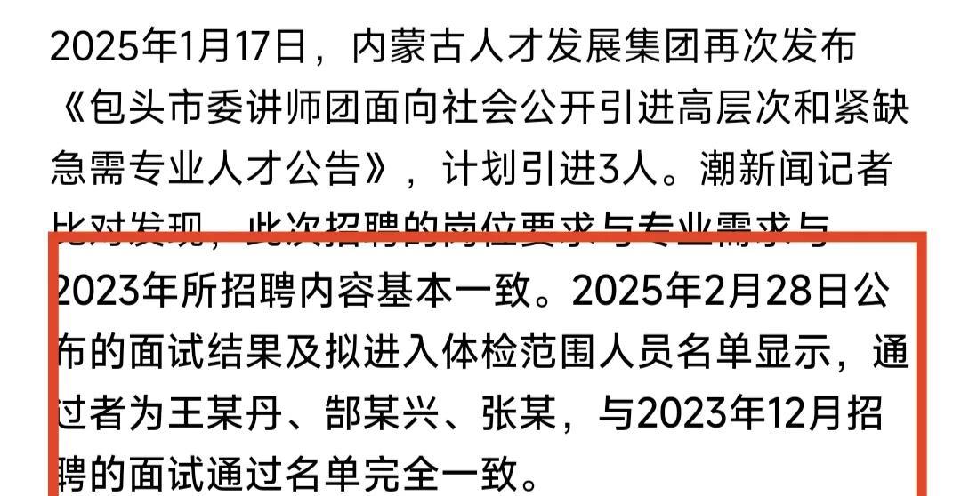 #头号创作者激励计划#闹得沸沸扬扬的包头讲师团被网友质疑“萝卜岗“招聘一事,迎来了最终处理结果,2025年人才招聘无效,主要负责人被免职降级或者诫免谈话,而原因是因为因人设岗,监督工作不到位,议事决策程序不规范。其实就是不说萝卜岗招聘,这就是“萝卜岗”。2025年招聘面试通过入围体检的三个人,竟然就是2023年那三个人,可以理解为这三个岗位一直在等着三个人。 网友痛恨“萝卜岗”招聘久矣,因为这不是在招聘人才,这是在为人而招聘。我劝天公重抖擞,不拘一格降人才,是该重温这句话了。