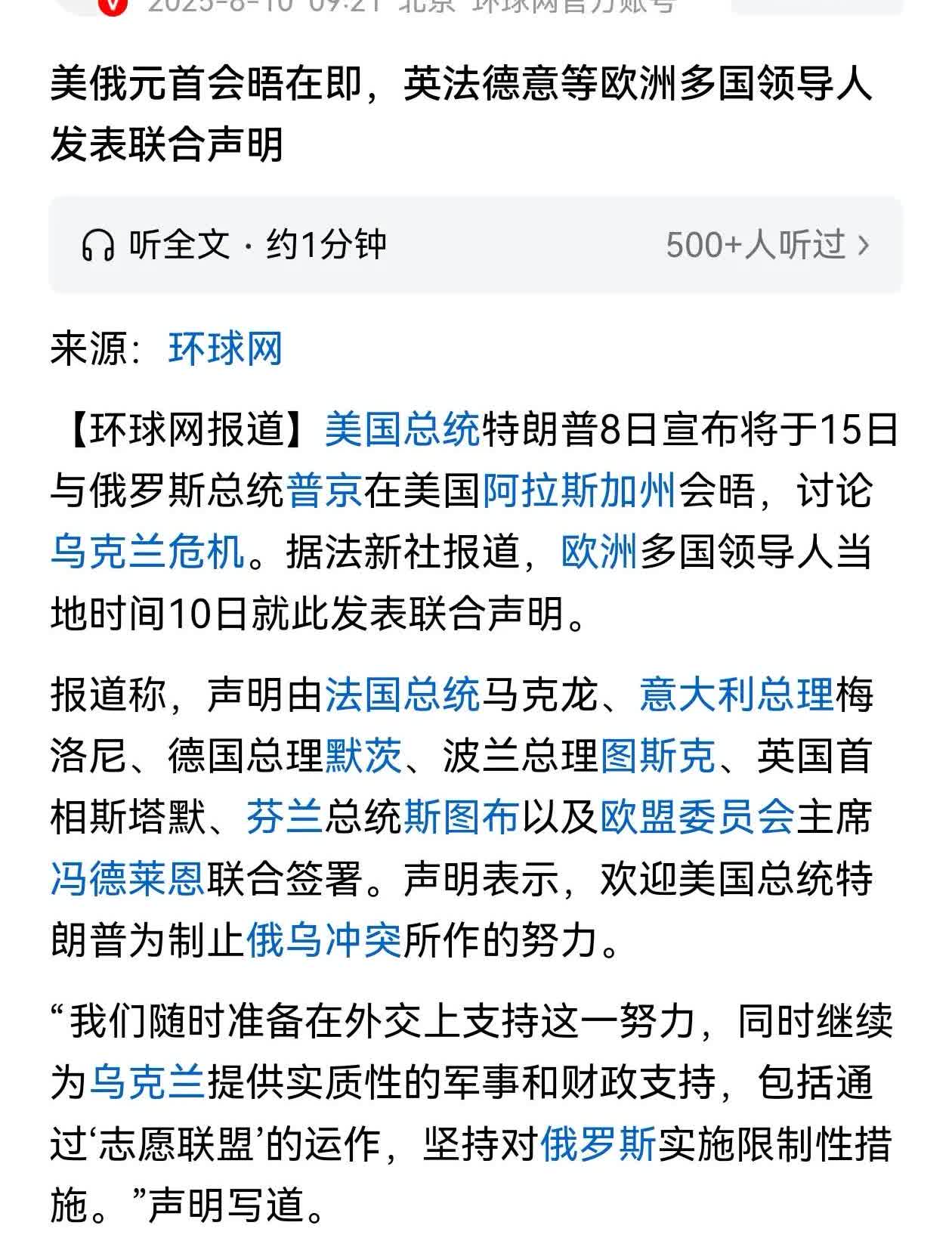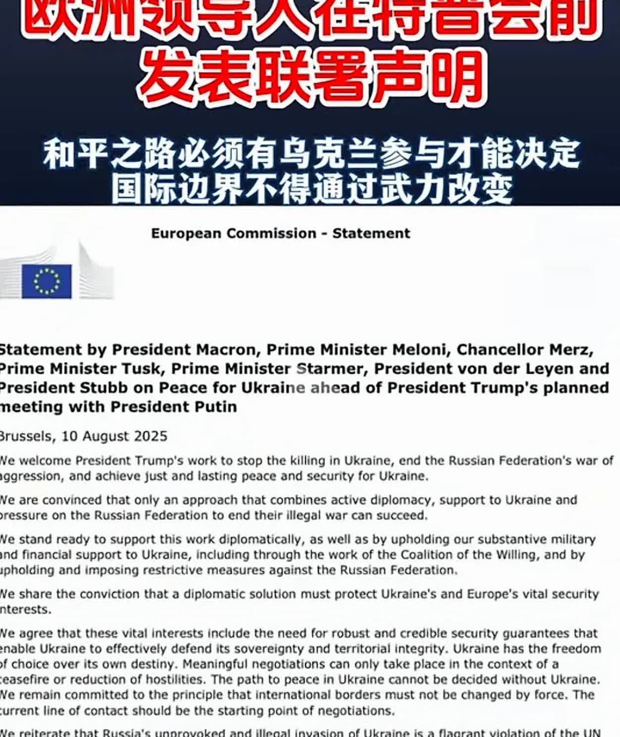 美俄元首会晤在即,欧洲六国领导人今天(8月10日)发表联合声明,声明由马克龙、斯