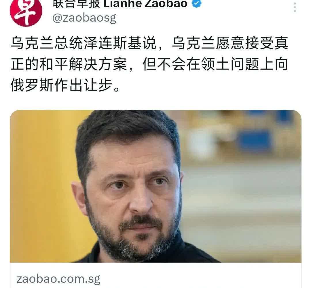 新加坡联合早报昨晚(8月9日)报道:“乌克兰总统泽连斯基说,乌克兰愿意接受公正的