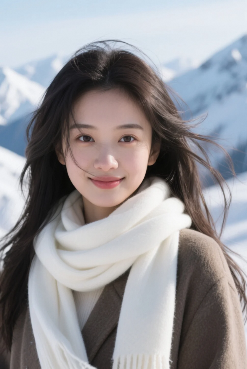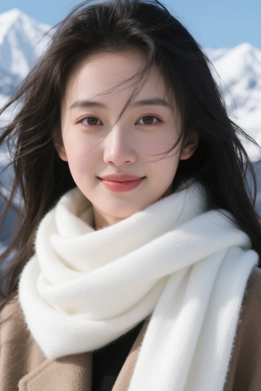 白色围巾映雪山,她美得静谧