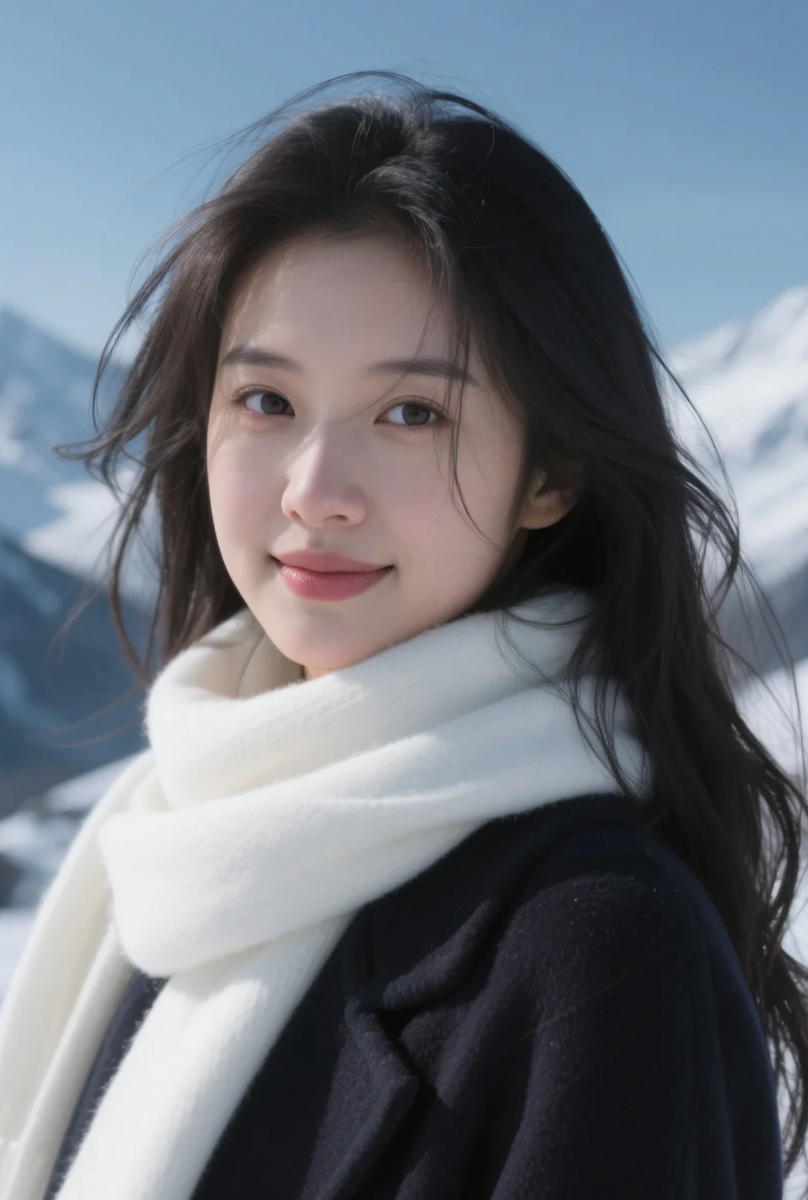 白色围巾映雪山,她美得静谧