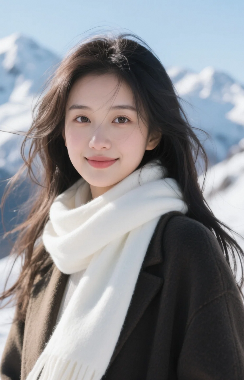 白围巾点亮画面,她静静伫立雪之巅