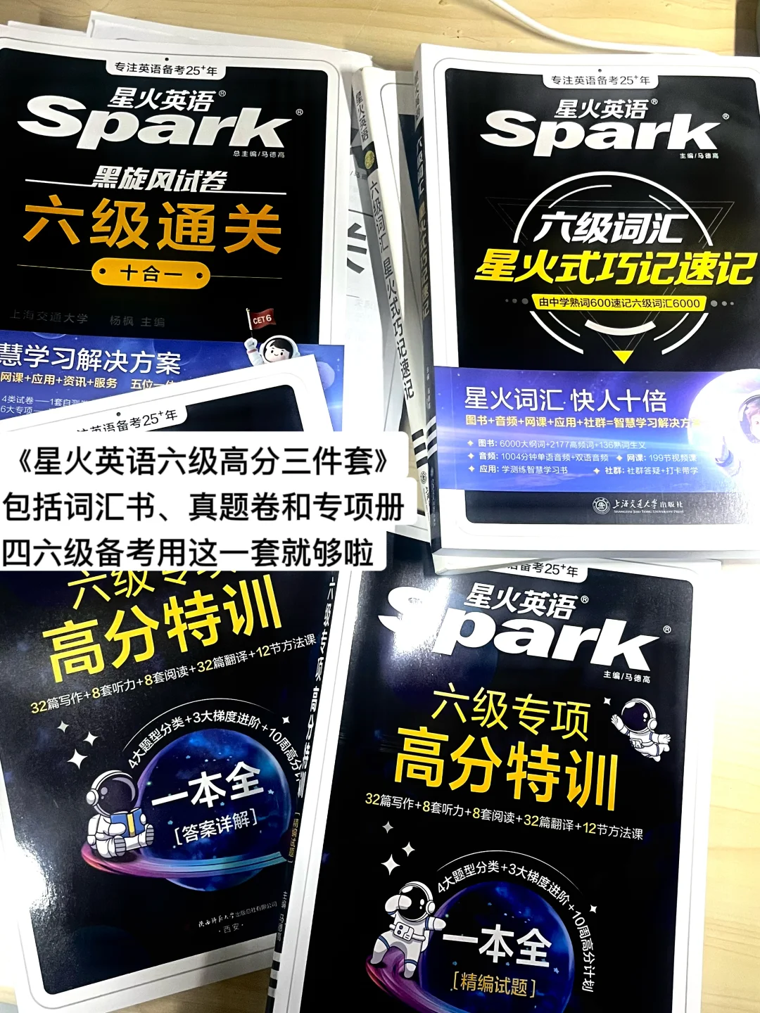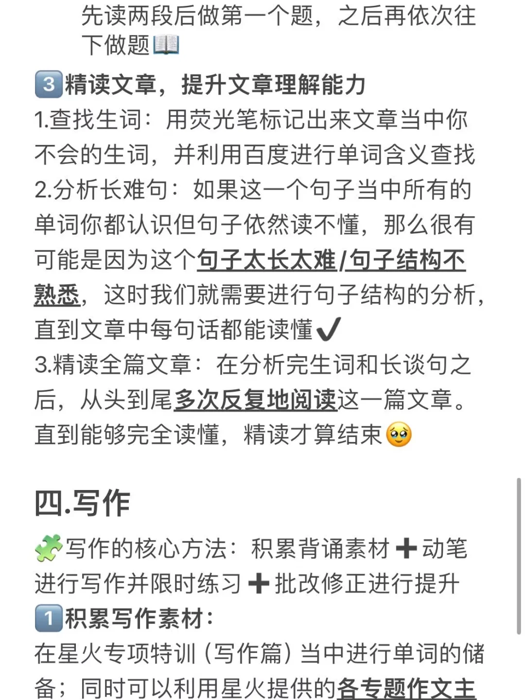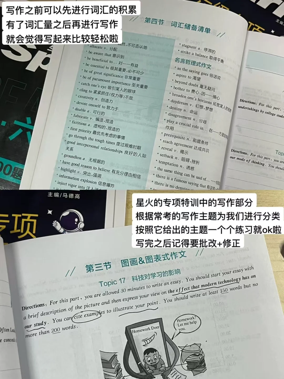 📝在学习这四部分专项的时候,可以先看星火专项练习中提出的原创解题方法,并且在做题前积累一部分听力词汇/写作常用的句型模板/翻译主题词等,然后按照星火专题训练册的顺序进行练习即可