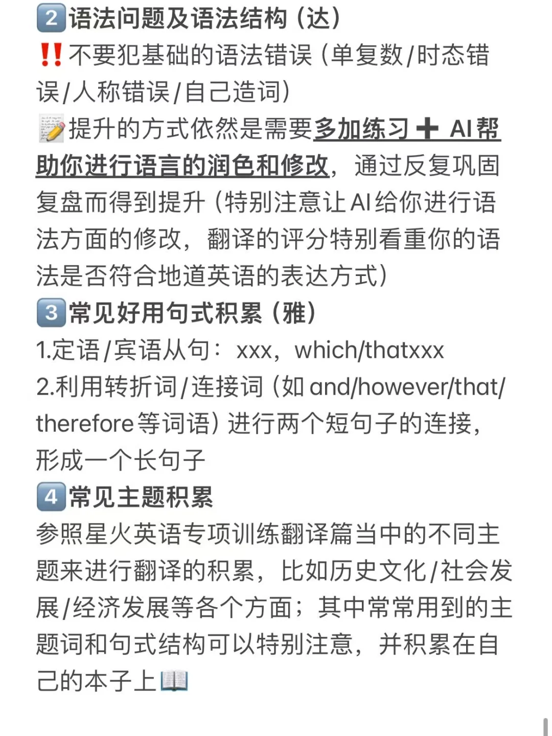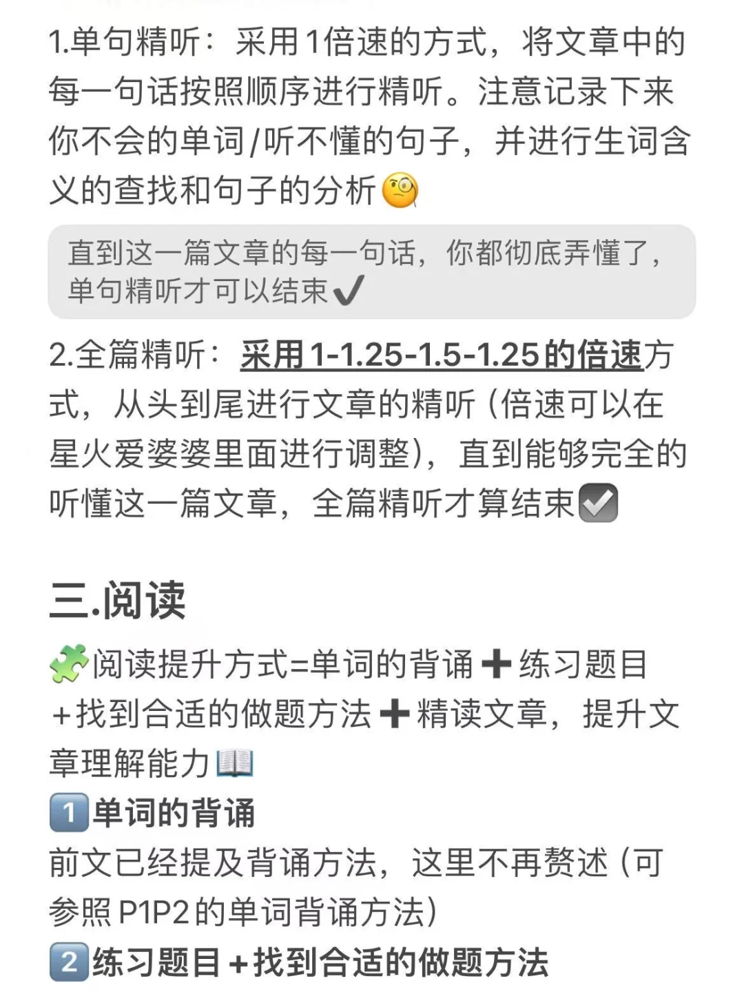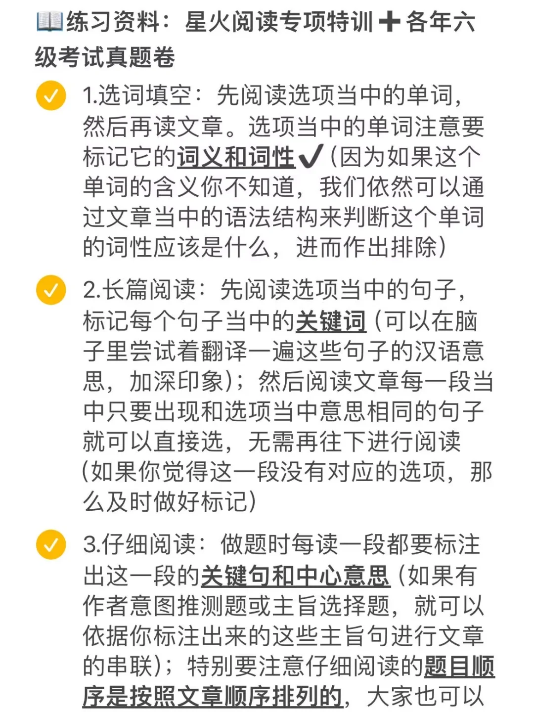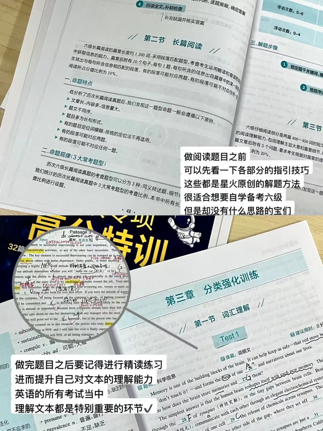 📝在学习这四部分专项的时候,可以先看星火专项练习中提出的原创解题方法,并且在做题前积累一部分听力词汇/写作常用的句型模板/翻译主题词等,然后按照星火专题训练册的顺序进行练习即可