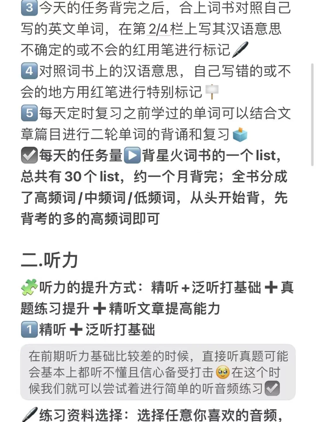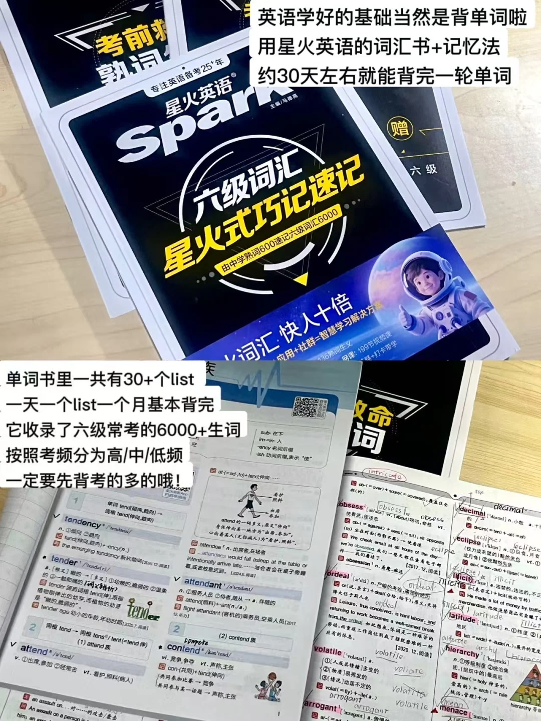 📝根据星火分成的30个list进行单词的背诵即可,全书分成高频/中频/低频词,可以先背考得多的~《星火英语六级词汇》采用的是星火式记忆法,从600个中学学过的熟悉的单词出发,帮助我们记住六级的6000个生词,可以在单词背诵上少花一些时间留出更多的时间给题目的练习!