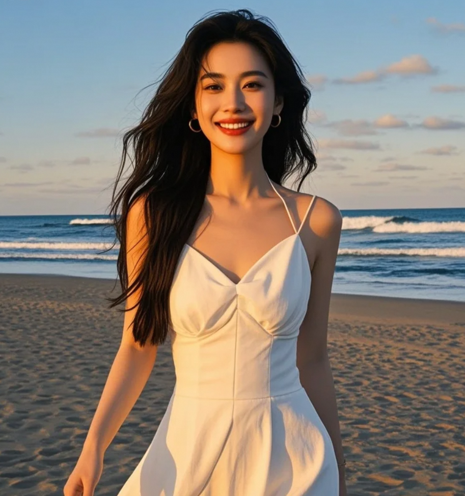 夕照熔金,白裙与长发在渐变色的海天间起舞