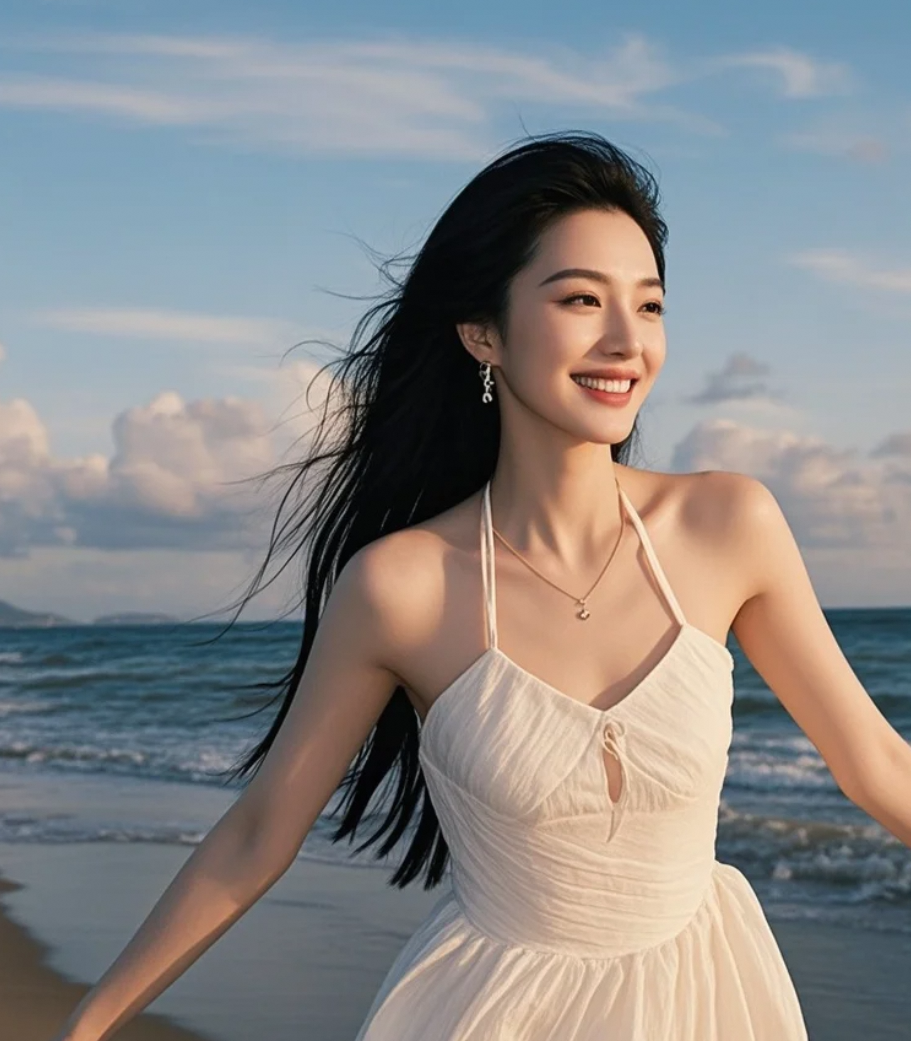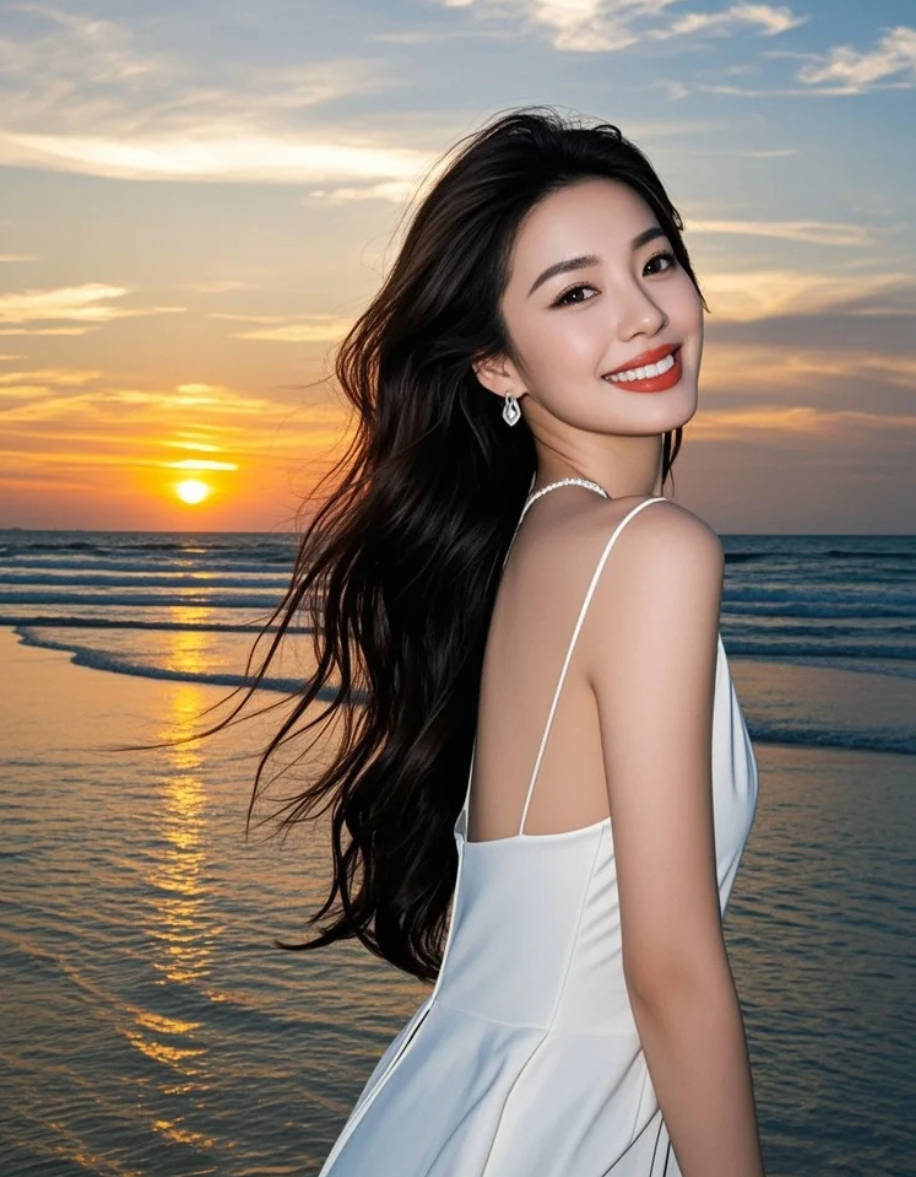 夕照熔金,白裙与长发在渐变色的海天间起舞