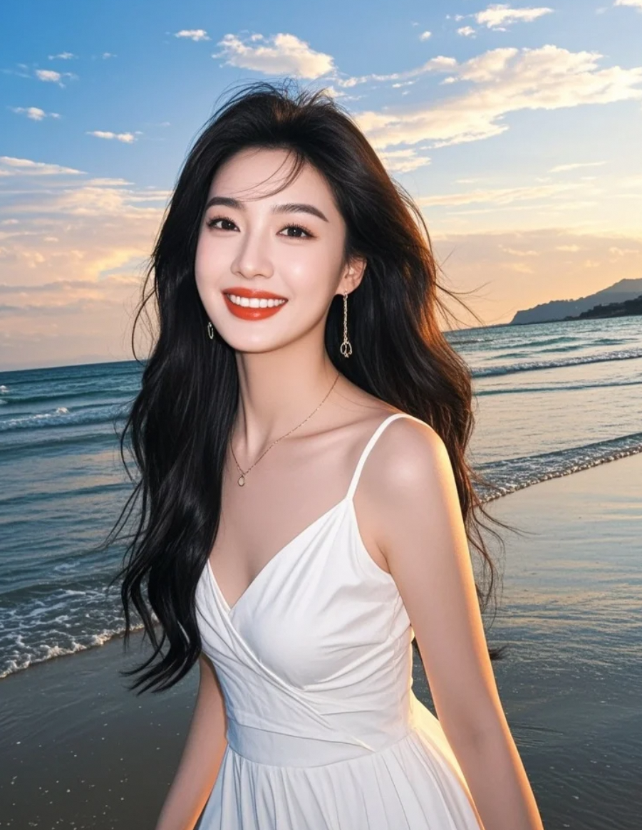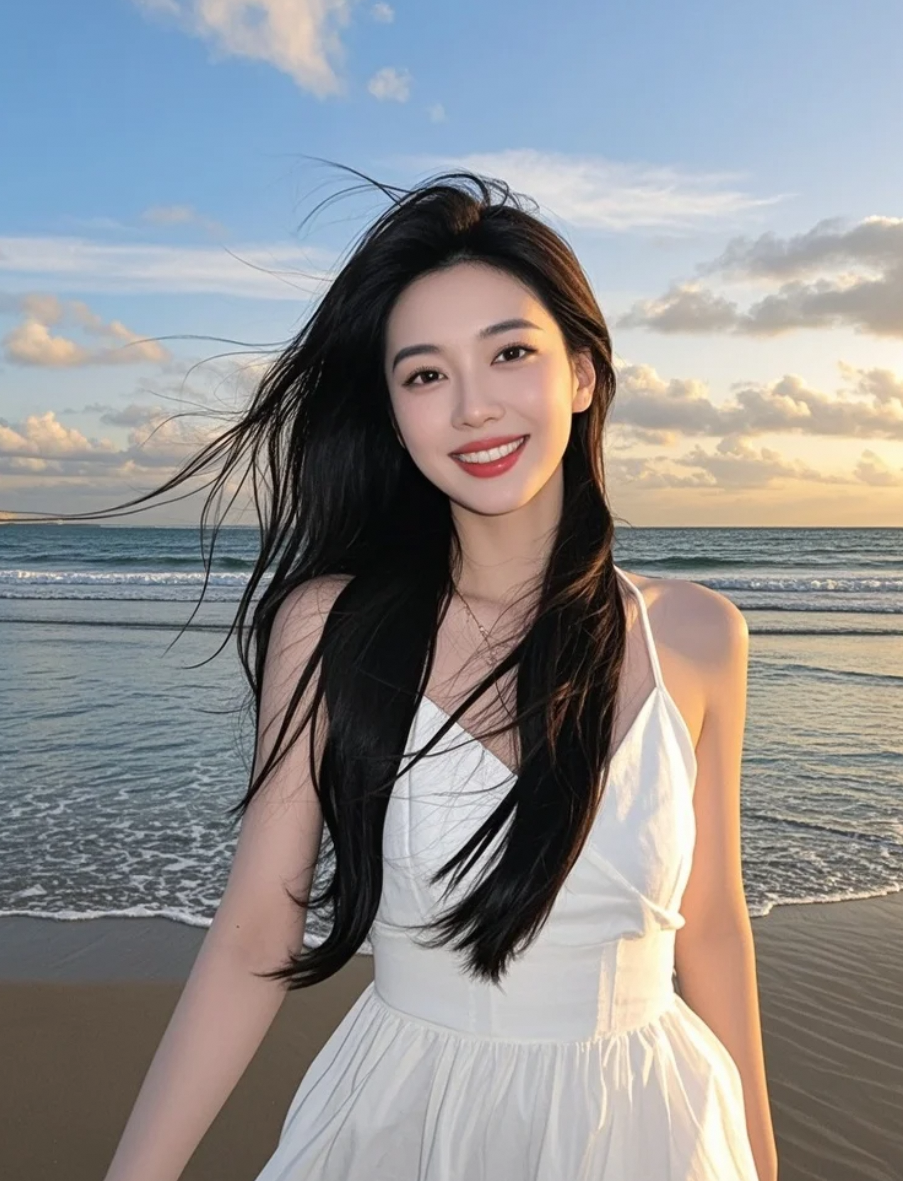 夕照熔金,白裙与长发在渐变色的海天间起舞