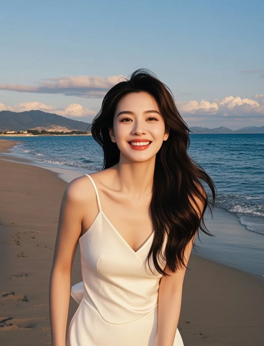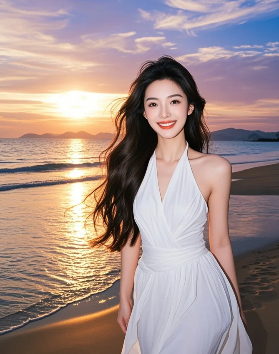 夕照熔金,白裙与长发在渐变色的海天间起舞