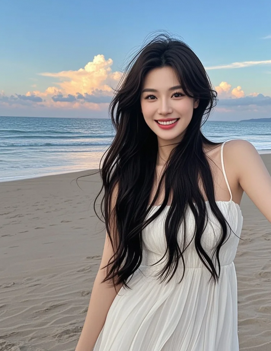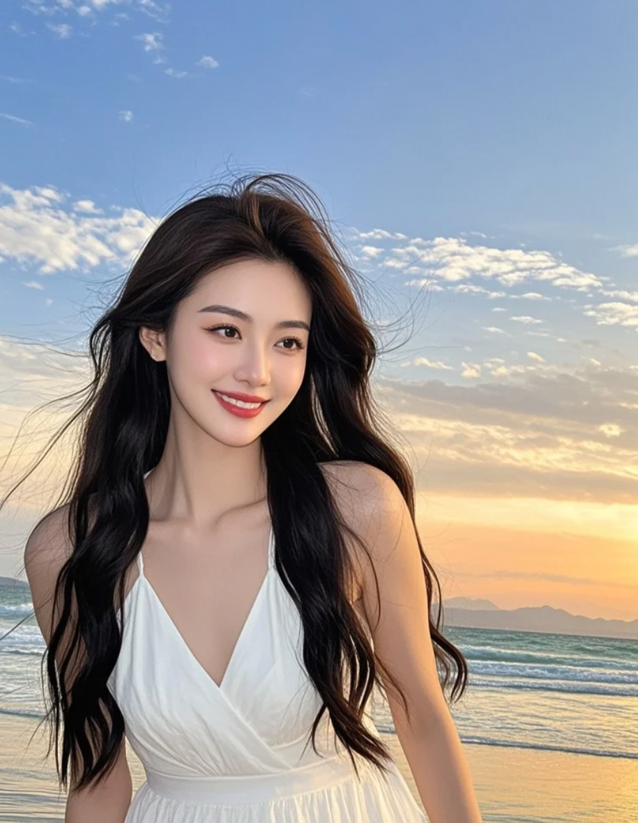 夕照熔金,白裙与长发在渐变色的海天间起舞
