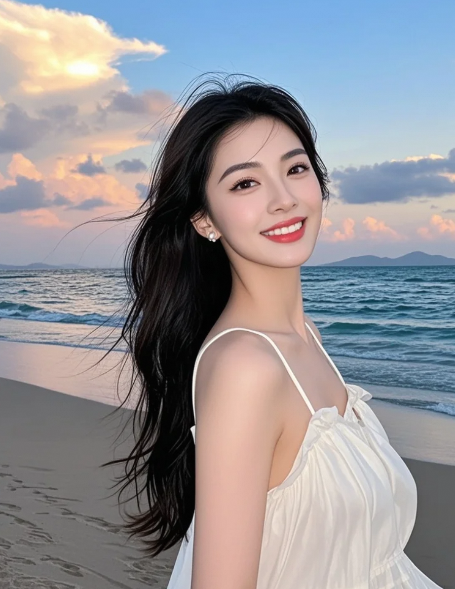 海风卷起裙角,露出被夕阳亲吻的脚踝,白裙如帆