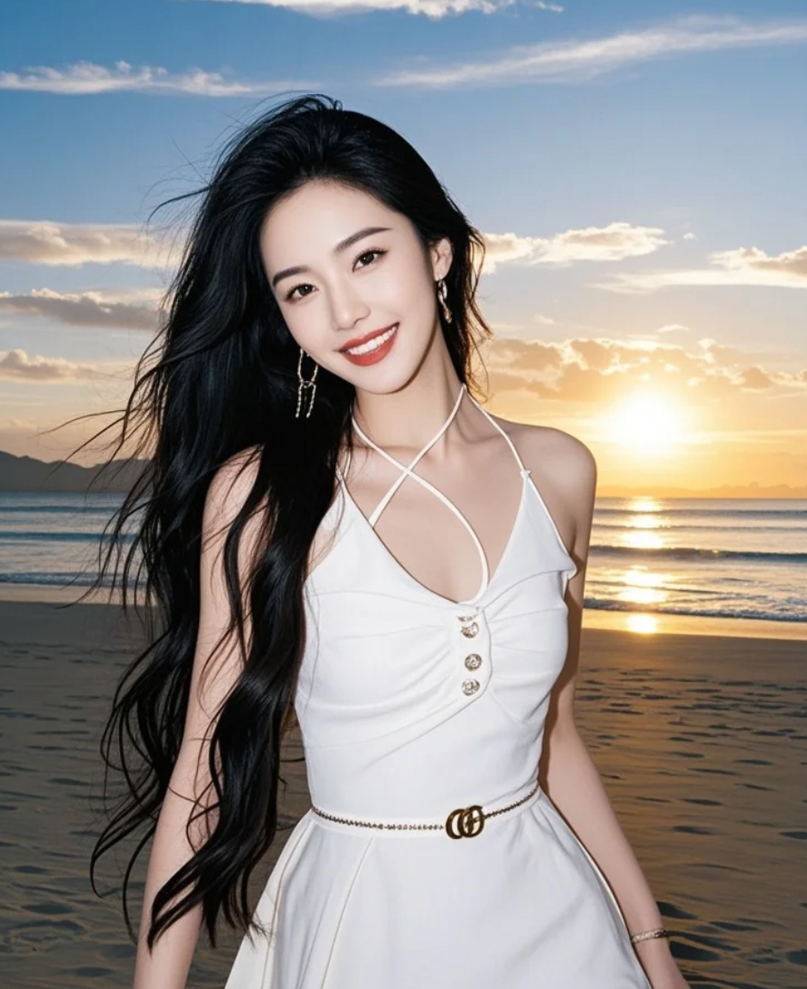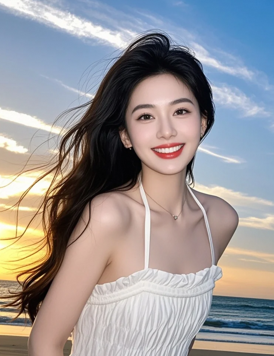 海风卷起裙角,露出被夕阳亲吻的脚踝,白裙如帆