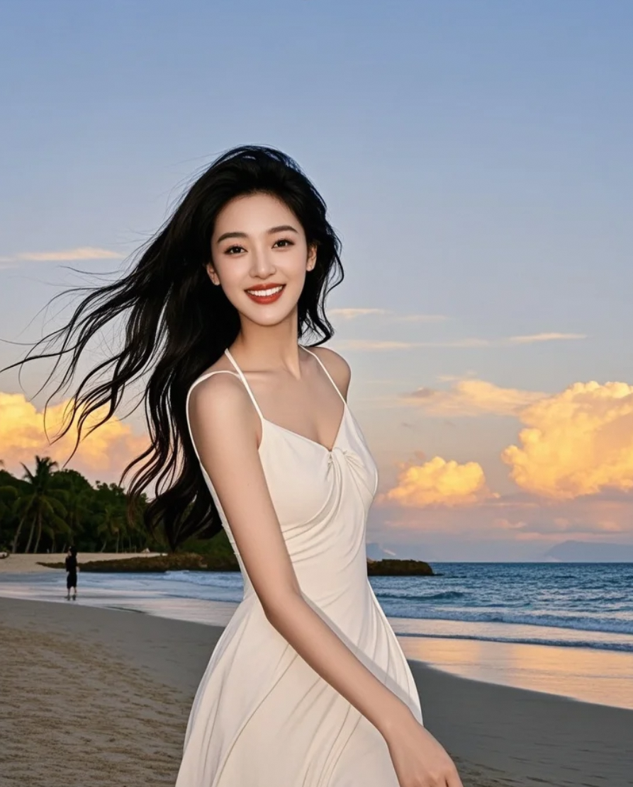 海风卷起裙角,露出被夕阳亲吻的脚踝,白裙如帆