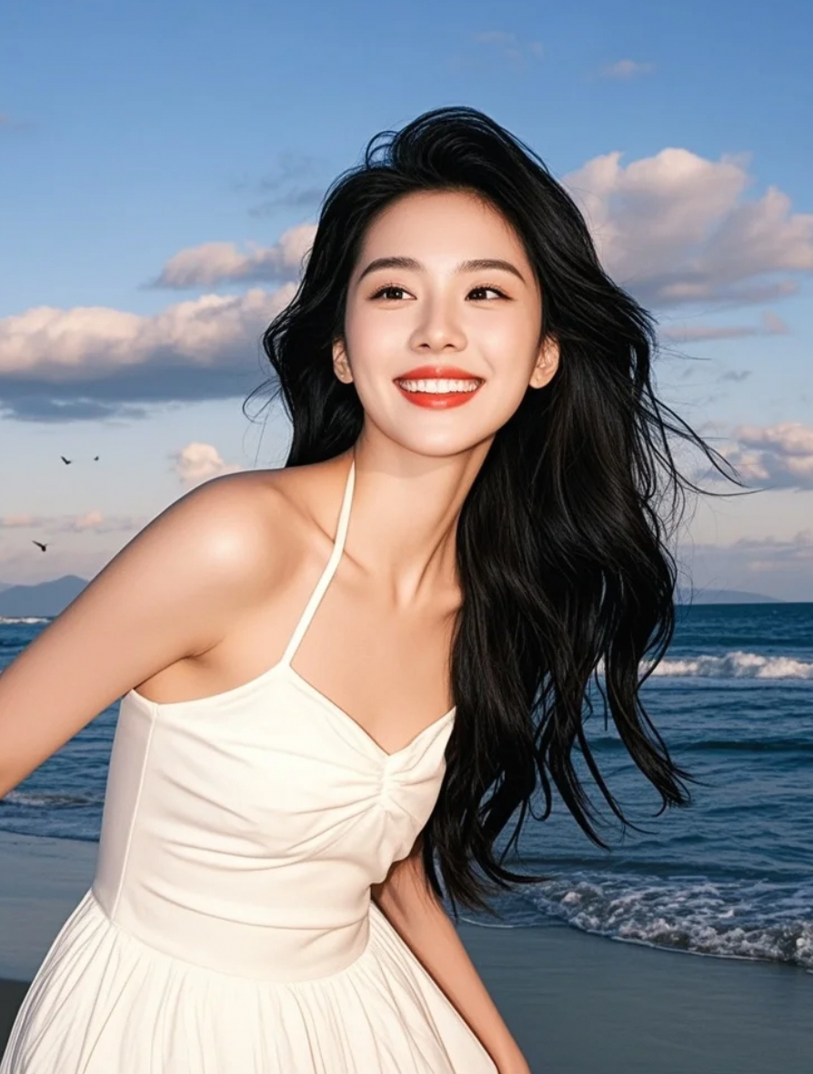 发丝在海风中狂舞,白裙如浪花般翻涌,自由不羁