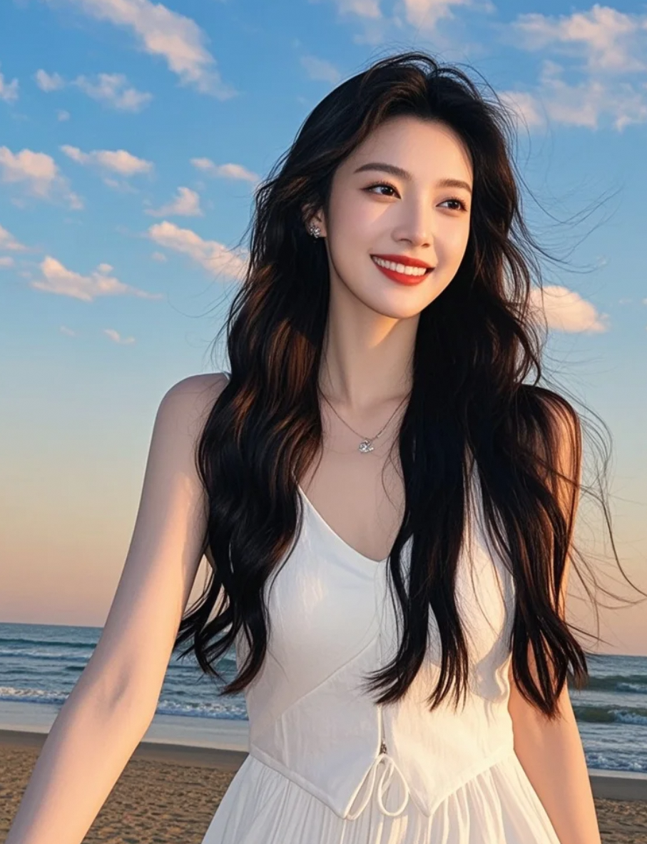 发丝缠绕着夕阳的余温,白裙盛满了海风的私语