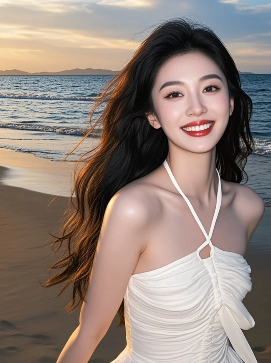 夕阳为伴,海风为友,白裙长发是她的全部行装