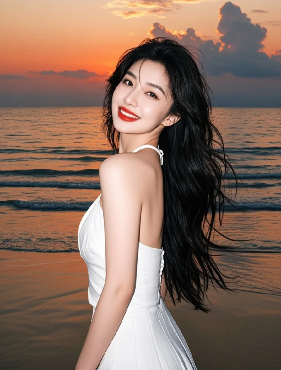 夕阳沉入海平线,她的白裙与长发仍悬在光里