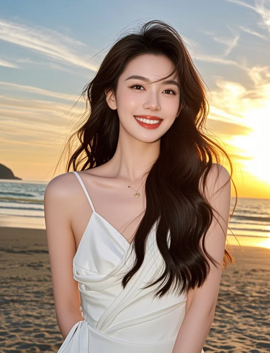 海风掀起白裙一角,露出纤细脚踝与沙粒