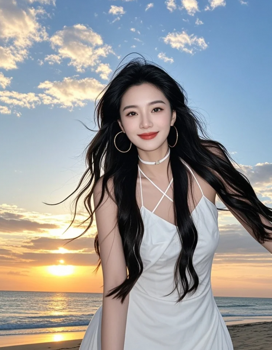 发梢扫过微咸的空气,白裙褶皱盛满夕阳
