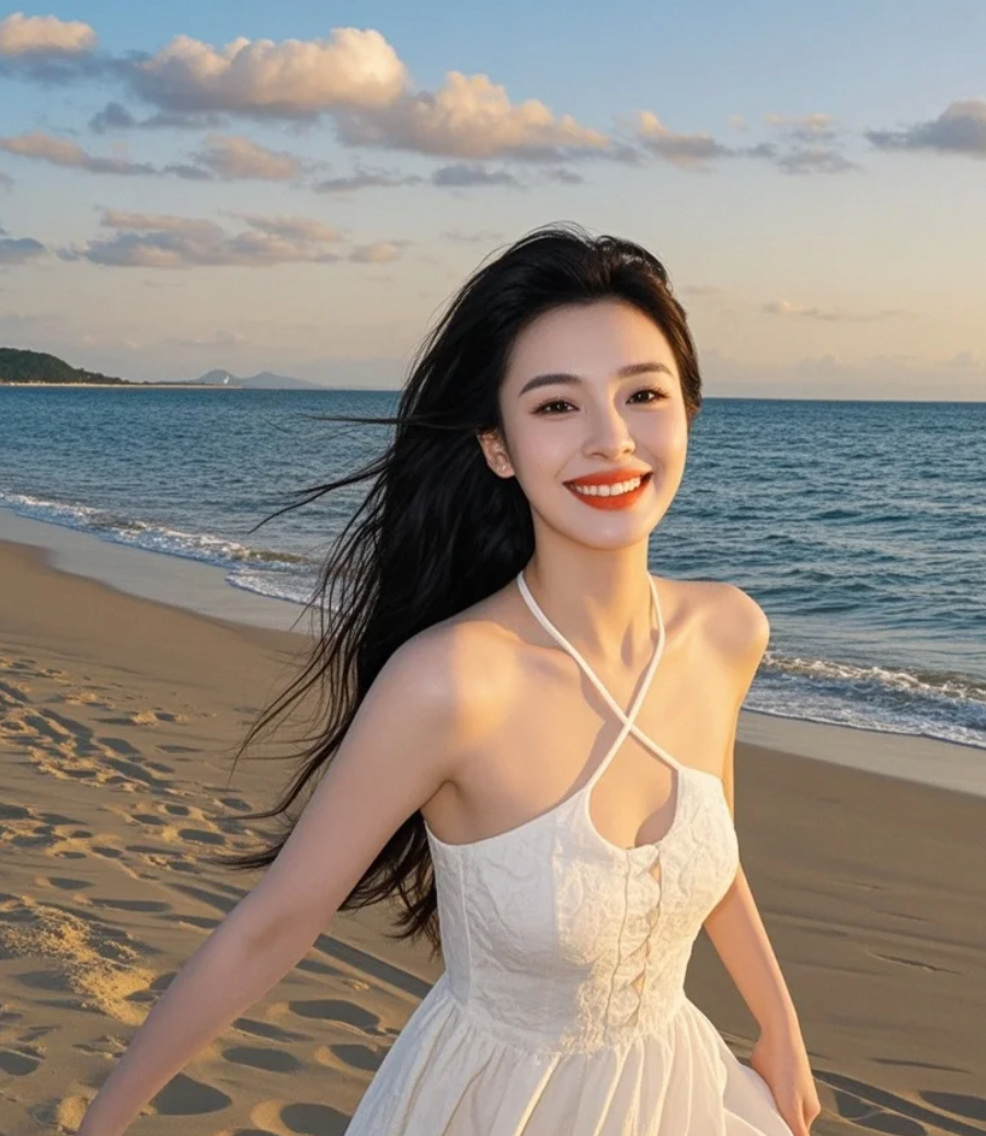 海风掀起白裙一角,露出纤细脚踝与沙粒