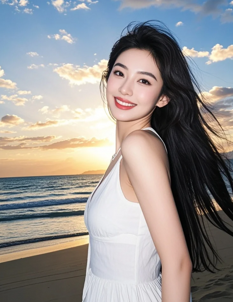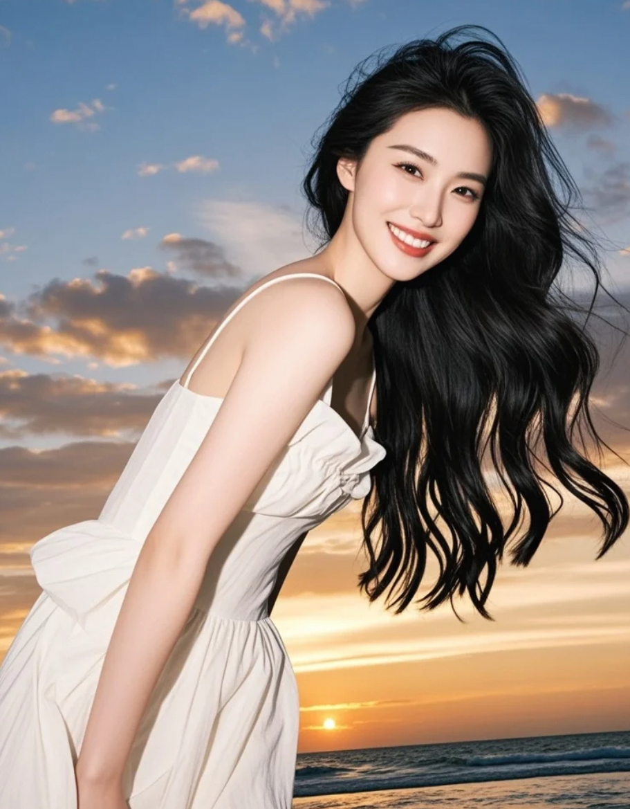 发梢扫过微咸的空气,白裙褶皱盛满夕阳