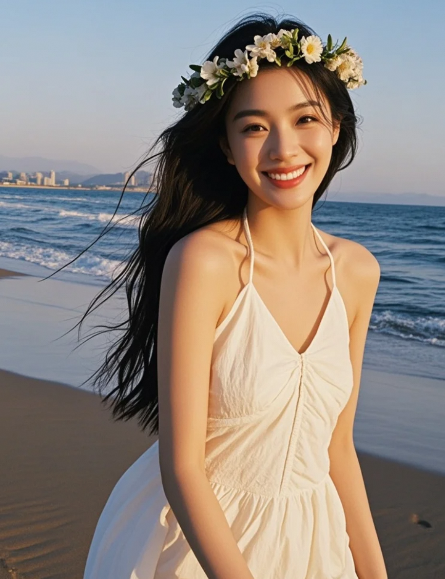 海风掀起白裙一角,露出纤细脚踝与沙粒
