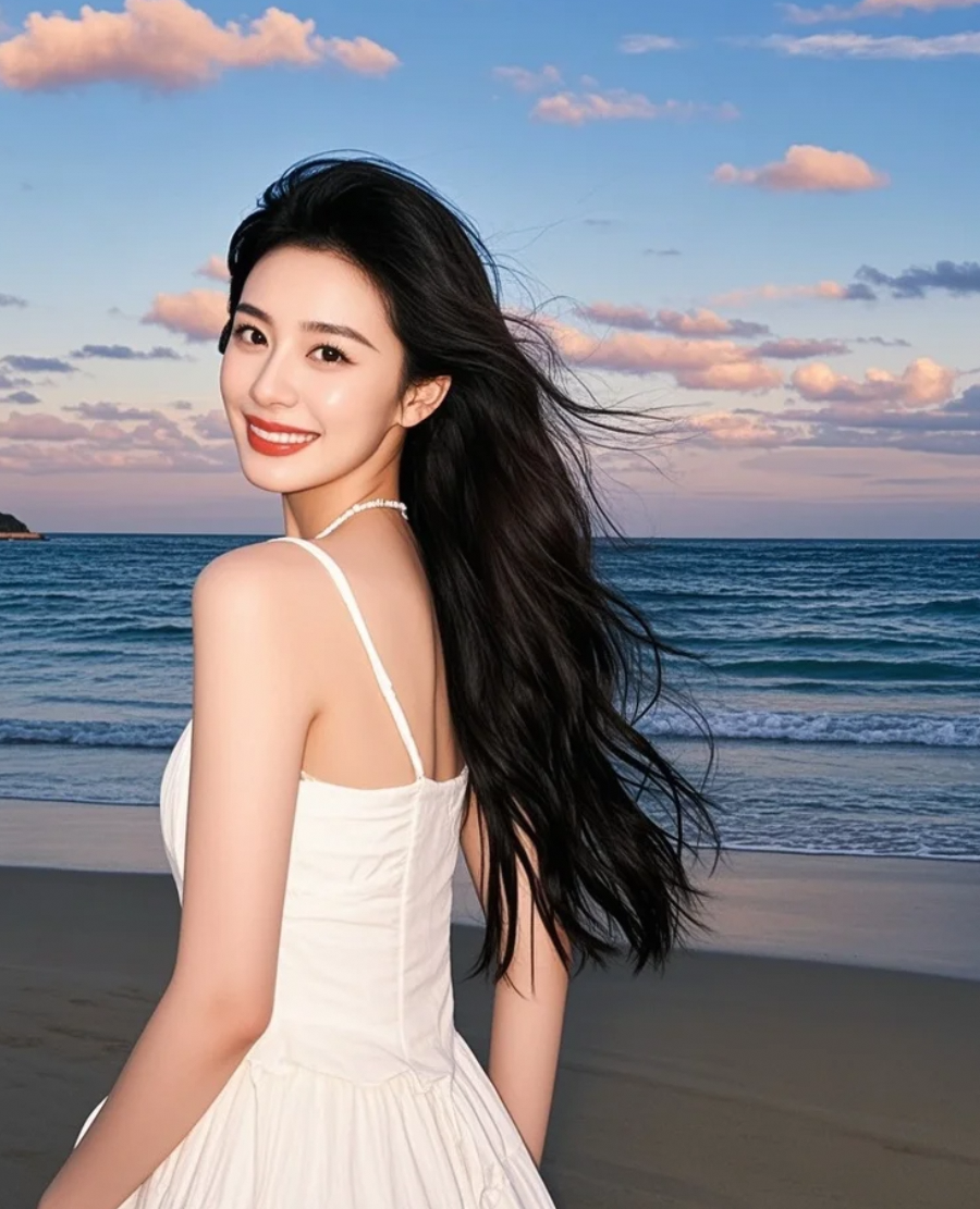 海风掀起白裙一角,露出纤细脚踝与沙粒