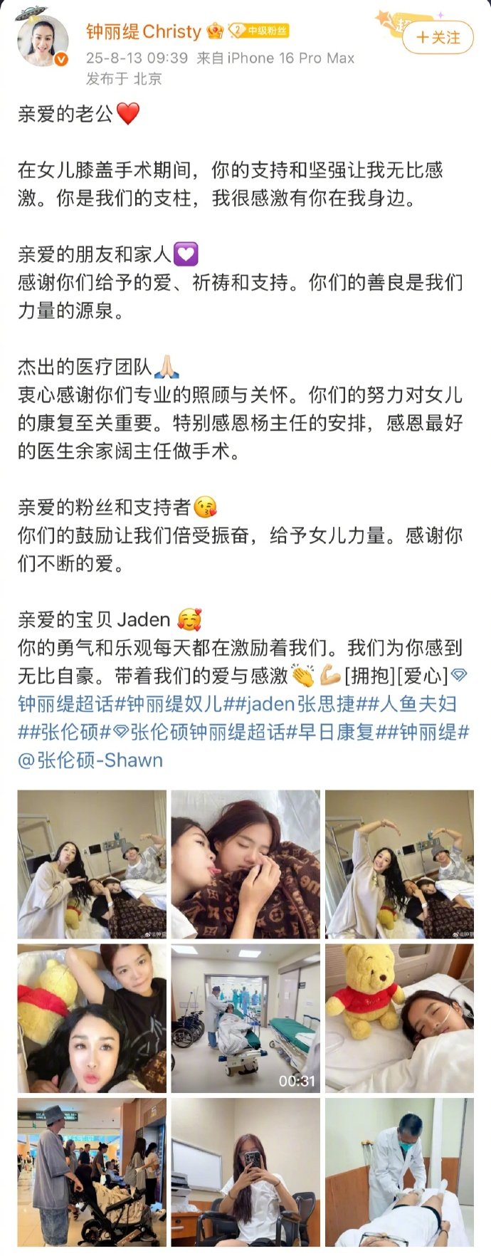 钟丽缇二女儿张思捷膝盖手术钟丽缇晒二女儿手术照晒二女儿Jaden术后照!Ja