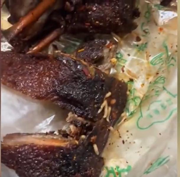 爬满蛆虫的鸭腿,给人吃还是给狗吃?重庆渝北区,一位顾客买鸭腿吃,打开一看,上面爬